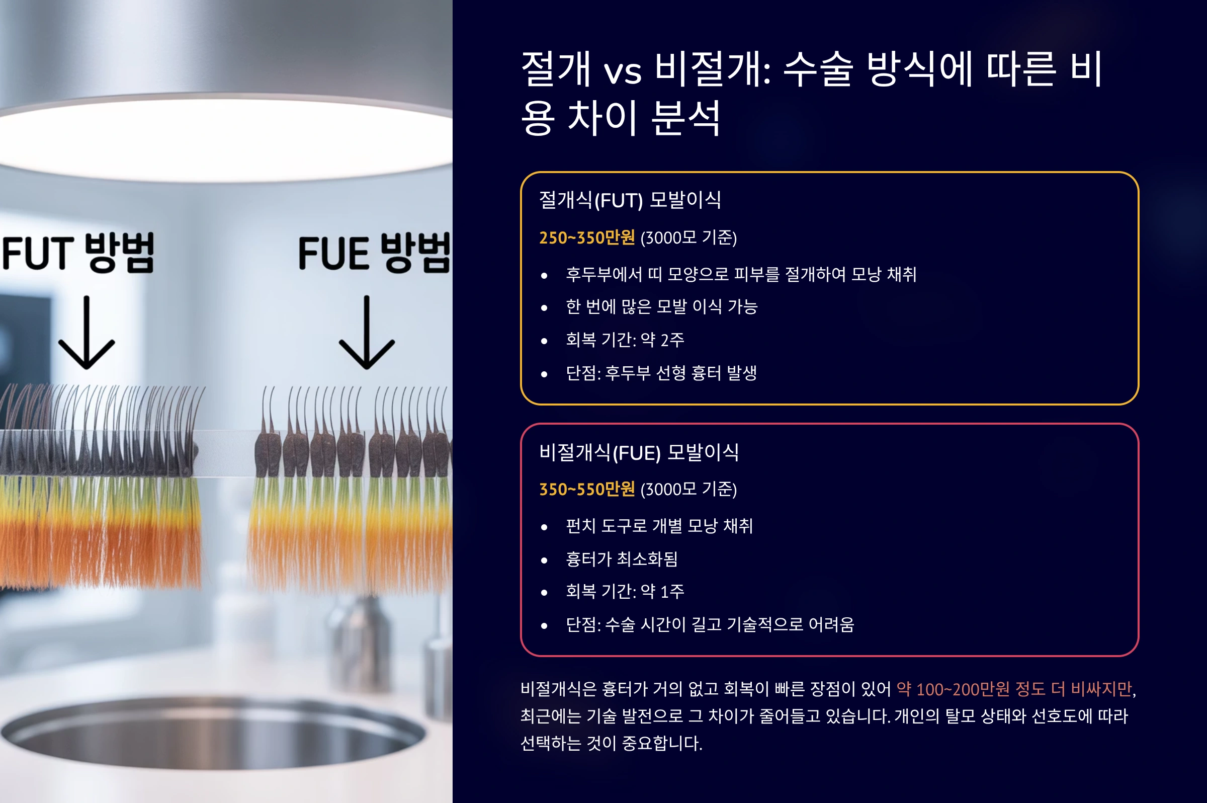 모발이식의 가장 큰 비용 차이는 '절개'와 '비절개' 수술 방식에서 비롯됩니다. 절개식은 후두부의 두피를 절개하여 모낭을 채취하는 방식으로, 비교적 한 번에 많은 양의 모낭을 얻을 수 있어 비용이 저렴한 편입니다. 반면, 비절개식은 모낭 하나하나를 채취하는 방식으로, 수술 시간이 길고 의료진의 높은 숙련도가 요구되어 비용이 더 높습니다.