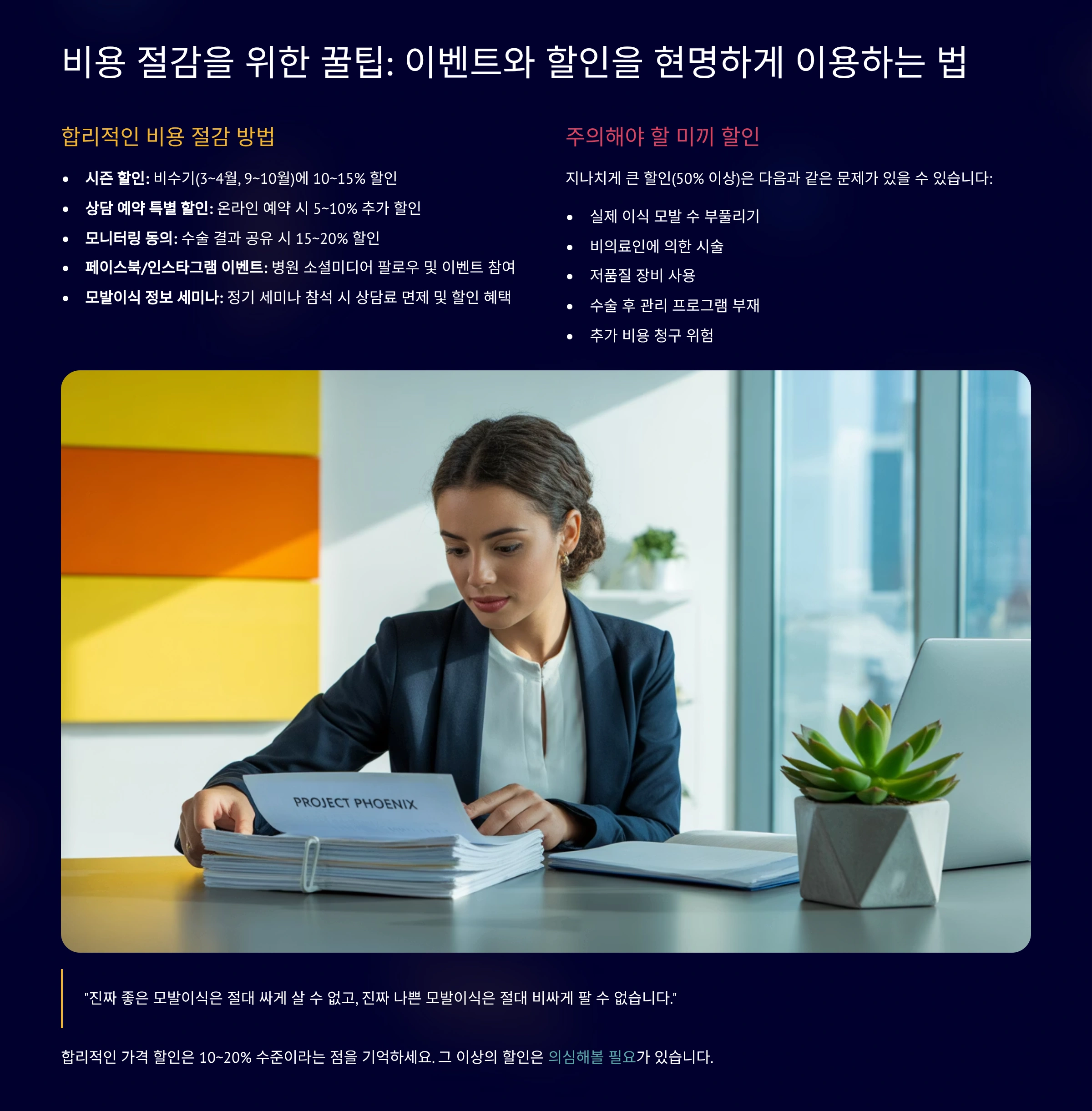 - 대규모 병원의 프로모션: 대형 모발이식 병원은 종종 대규모 프로모션을 진행하여 비용 부담을 줄여주는 경우가 있습니다.