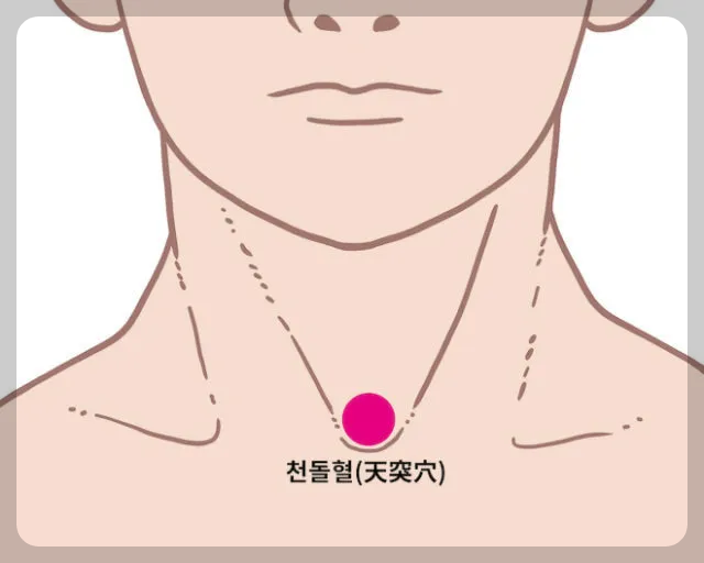 - 천돌혈 (天突穴): 목의 움푹 들어간 곳, 쇄골 사이 중앙에 위치합니다. 이곳을 부드럽게 지압하면 기관지 경련을 완화하고 가래 배출을 돕습니다.