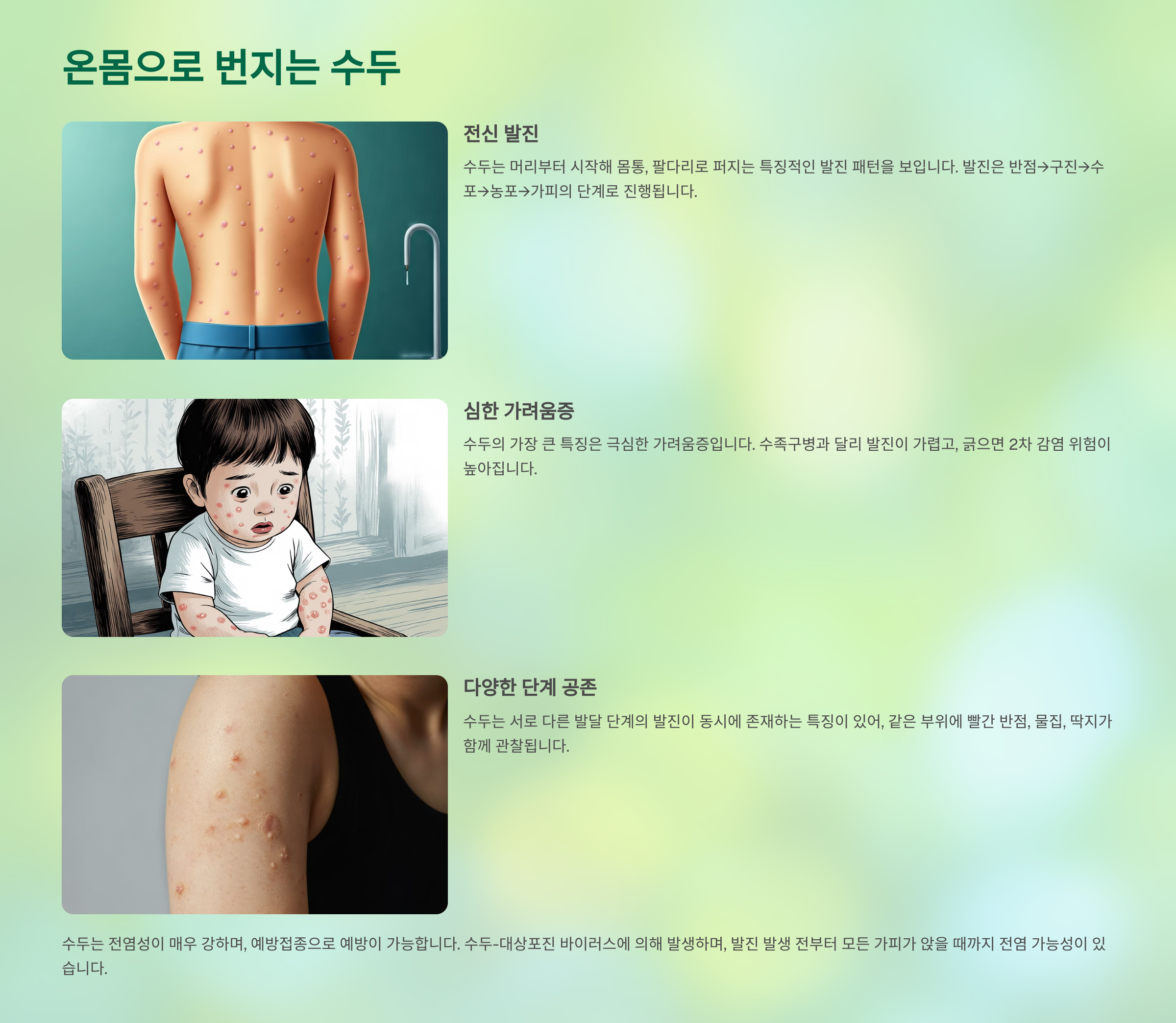 | 수두 | 전신 | 다양한 수포 + 딱지 | 가려움, 발열 | ✅ |