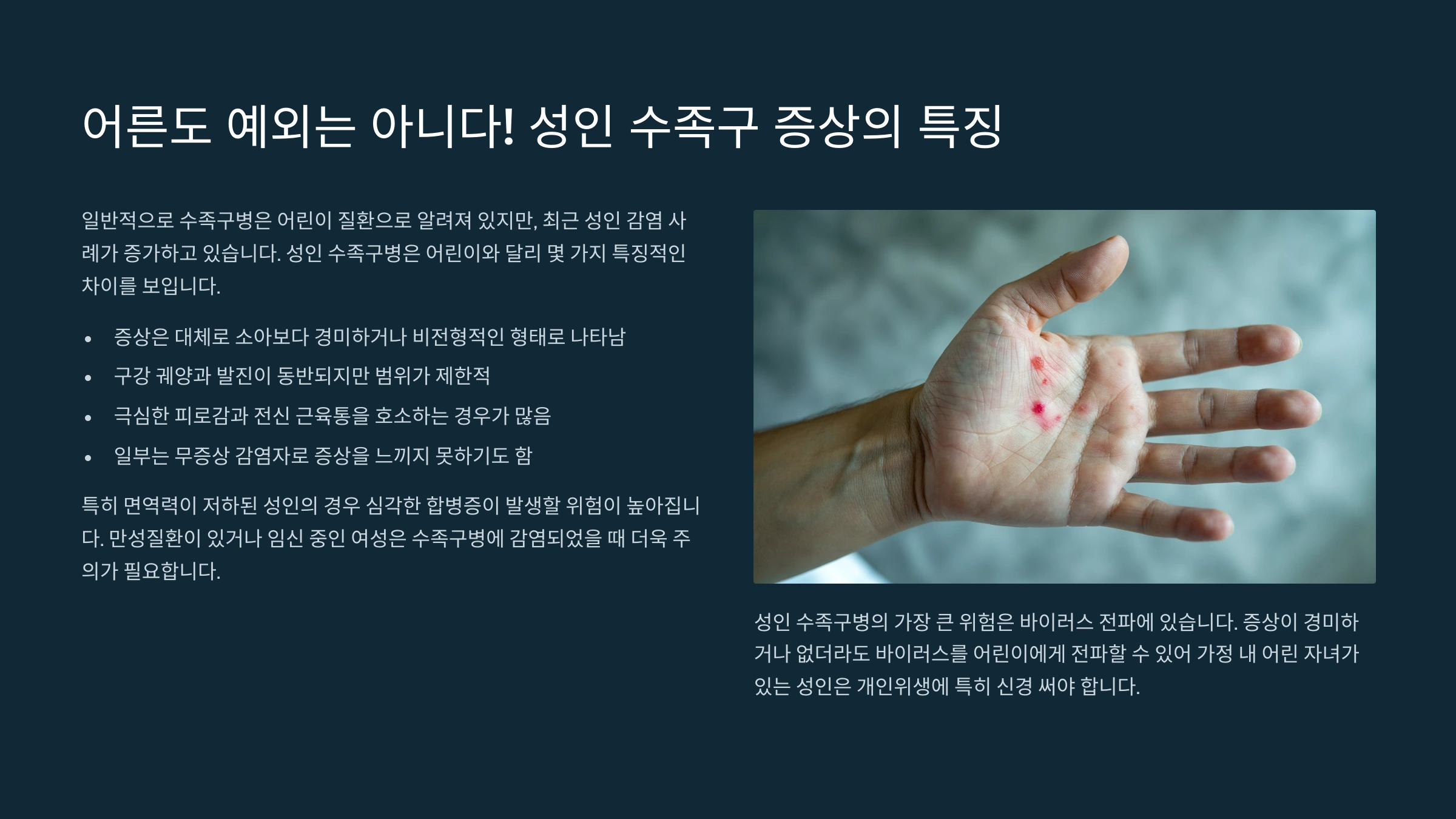 수족구병은 어린아이에게만 발생하는 병이라고 생각하기 쉬운데요, 사실 성인도 감염될 수 있어요. 특히 수족구에 걸린 아이를 돌보는 부모나 교사, 간호사처럼 밀접 접촉이 많은 어른에게서도 종종 발병한답니다.