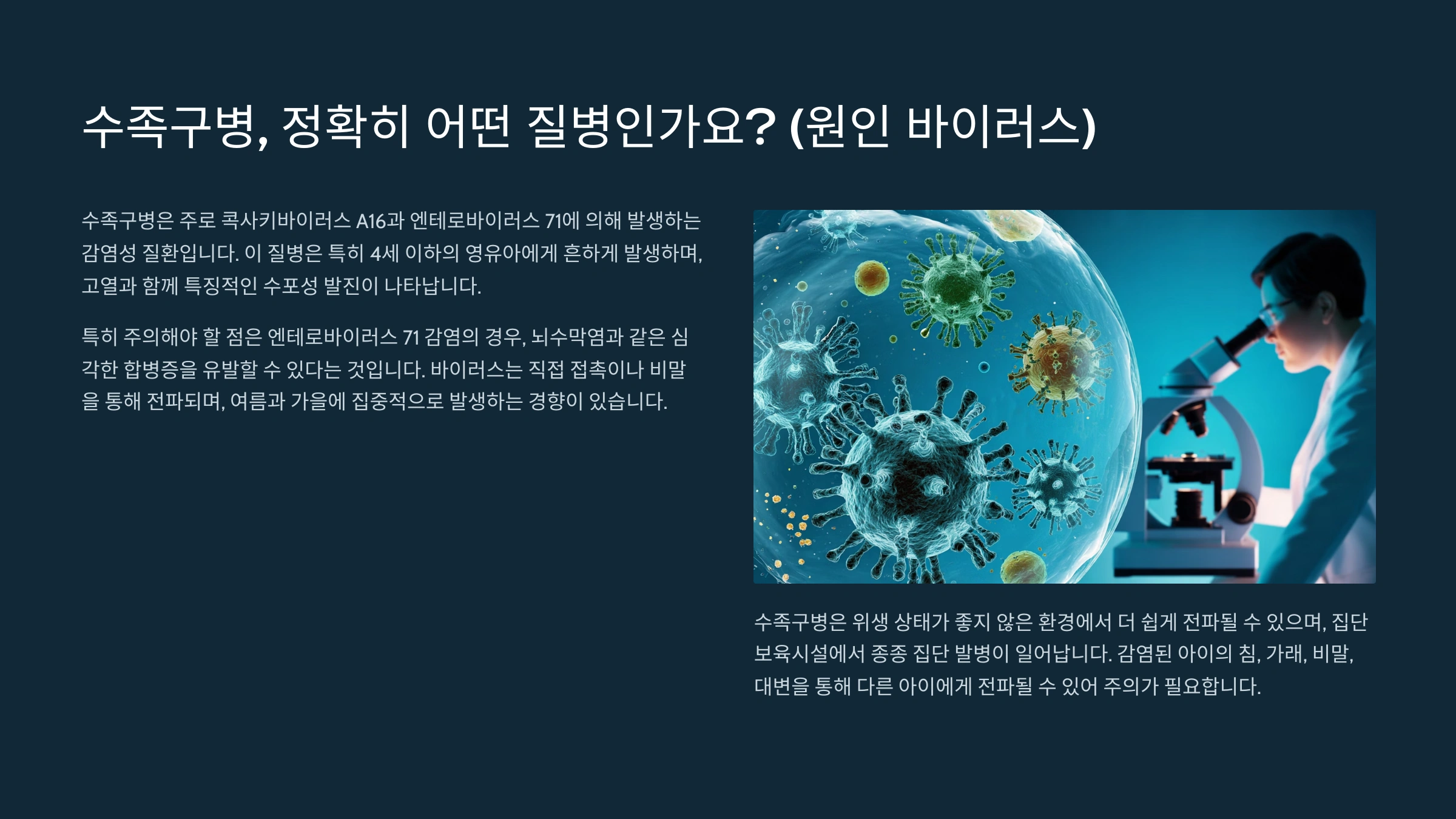 이처럼 수족구병은 단순한 바이러스 감염을 넘어서, 영유아 건강에 영향을 줄 수 있는 중요한 질환이에요. 정확한 원인과 특성을 이해하는 것이 초기 대응의 핵심이에요.