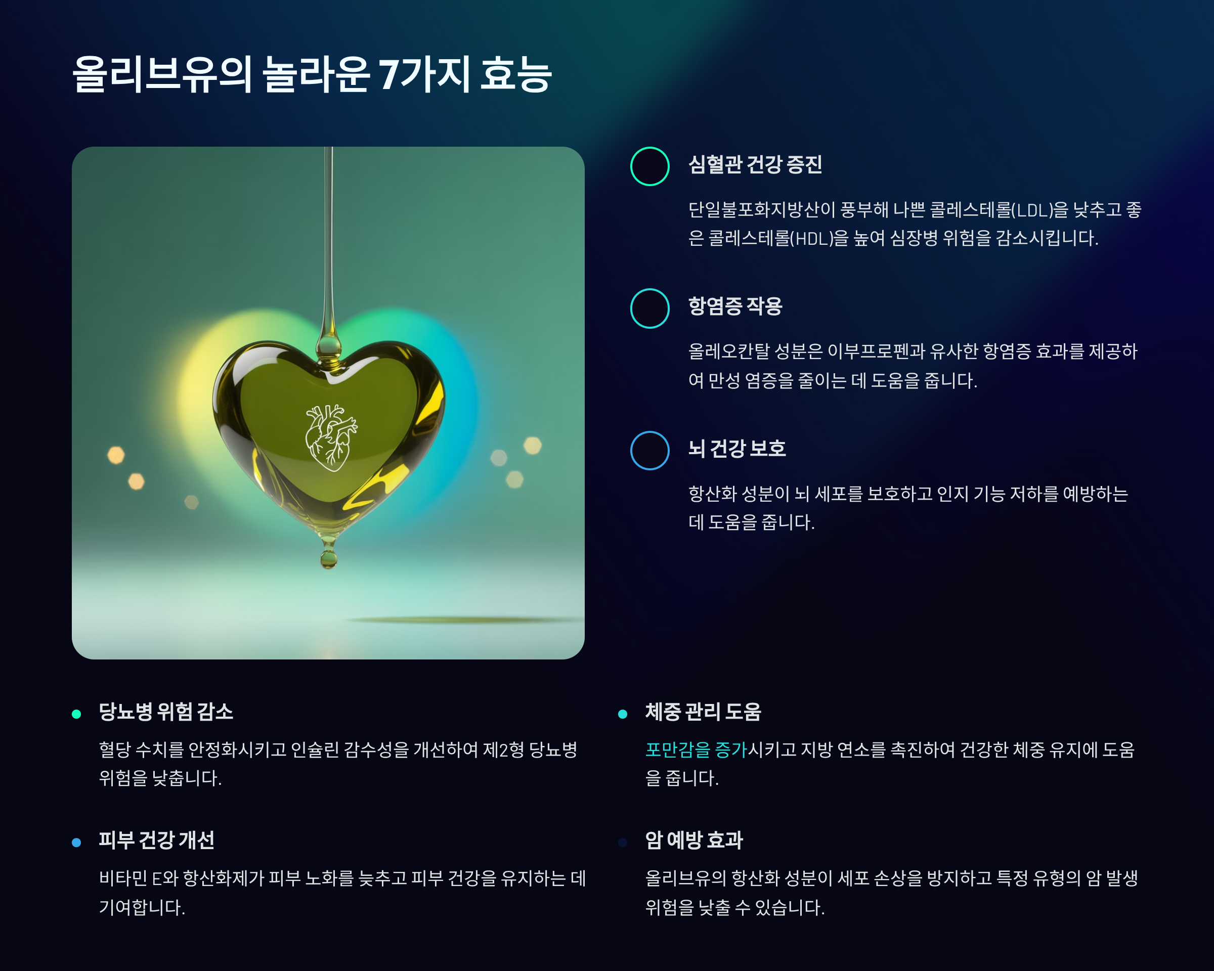 올리브유 효능: 놀라운 7가지 건강 효과와 올바른 섭취법 가이드