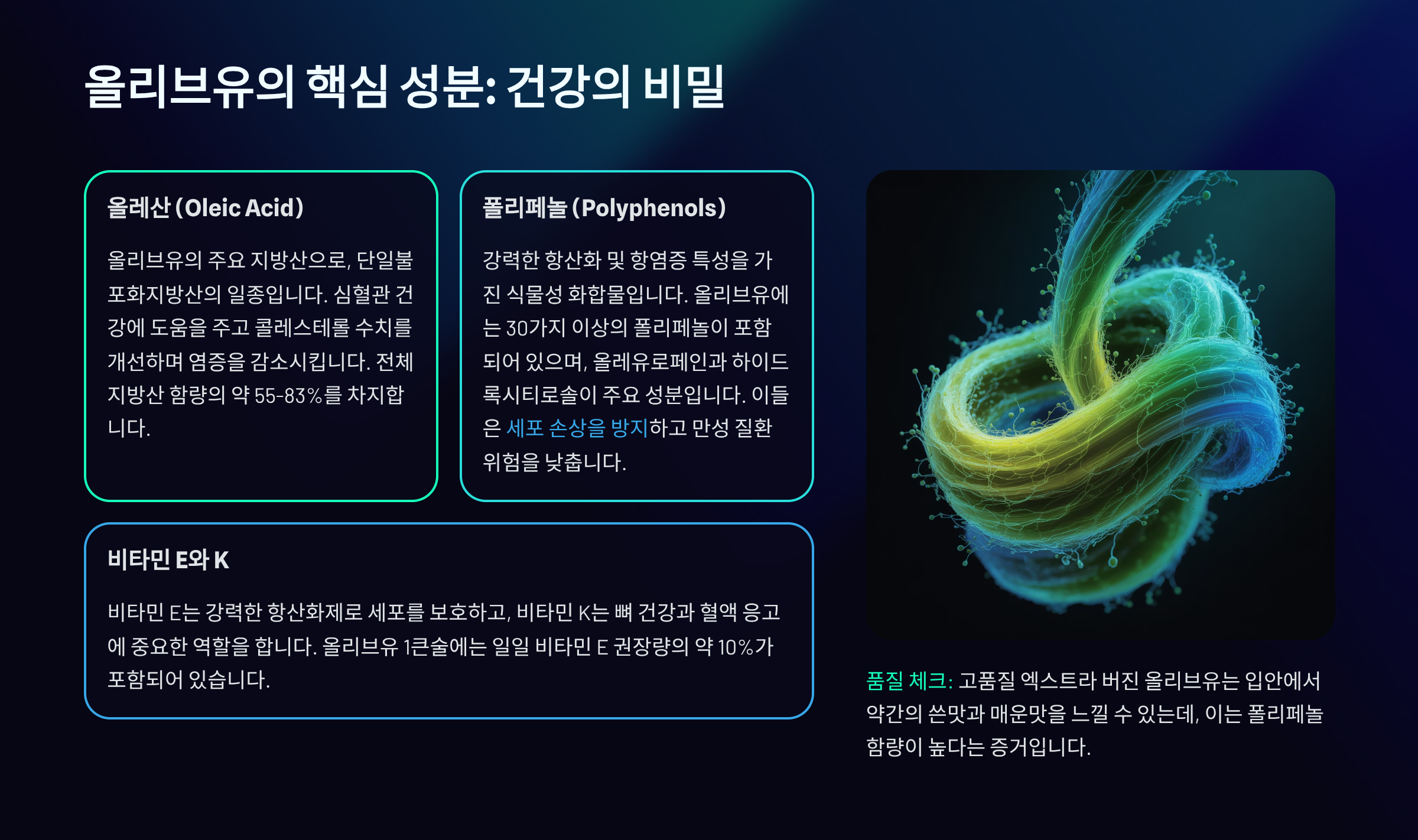 3. 올리브유의 핵심 성분: 폴리페놀과 올레산의 비밀 💡