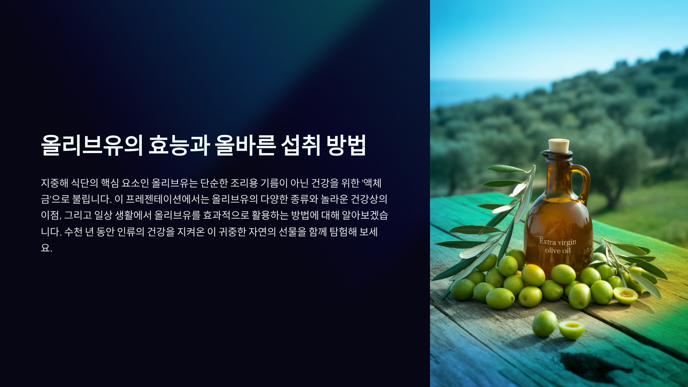 이 글은 올리브유의 과학적 근거가 있는 7가지 핵심 효능부터, 시중의 다양한 종류 중 나에게 맞는 올리브유를 고르는 법, 그리고 올바른 조리법까지 모든 것을 상세히 담았습니다. 이 가이드를 통해 올리브유를 식탁 위의 보약으로 활용해 보세요.