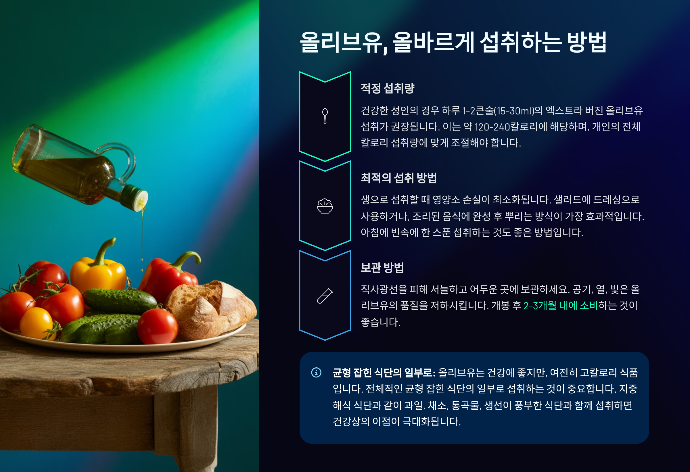 가장 좋은 섭취 방법은 열을 가하지 않고 생으로 먹는 것입니다. 엑스트라 버진 올리브유는 열에 약한 폴리페놀 성분이 풍부하기 때문입니다. 샐러드 드레싱으로 뿌리거나, 빵을 찍어 먹거나, 요리가 완성된 후 마지막에 살짝 둘러서 먹는 것이 좋습니다.
