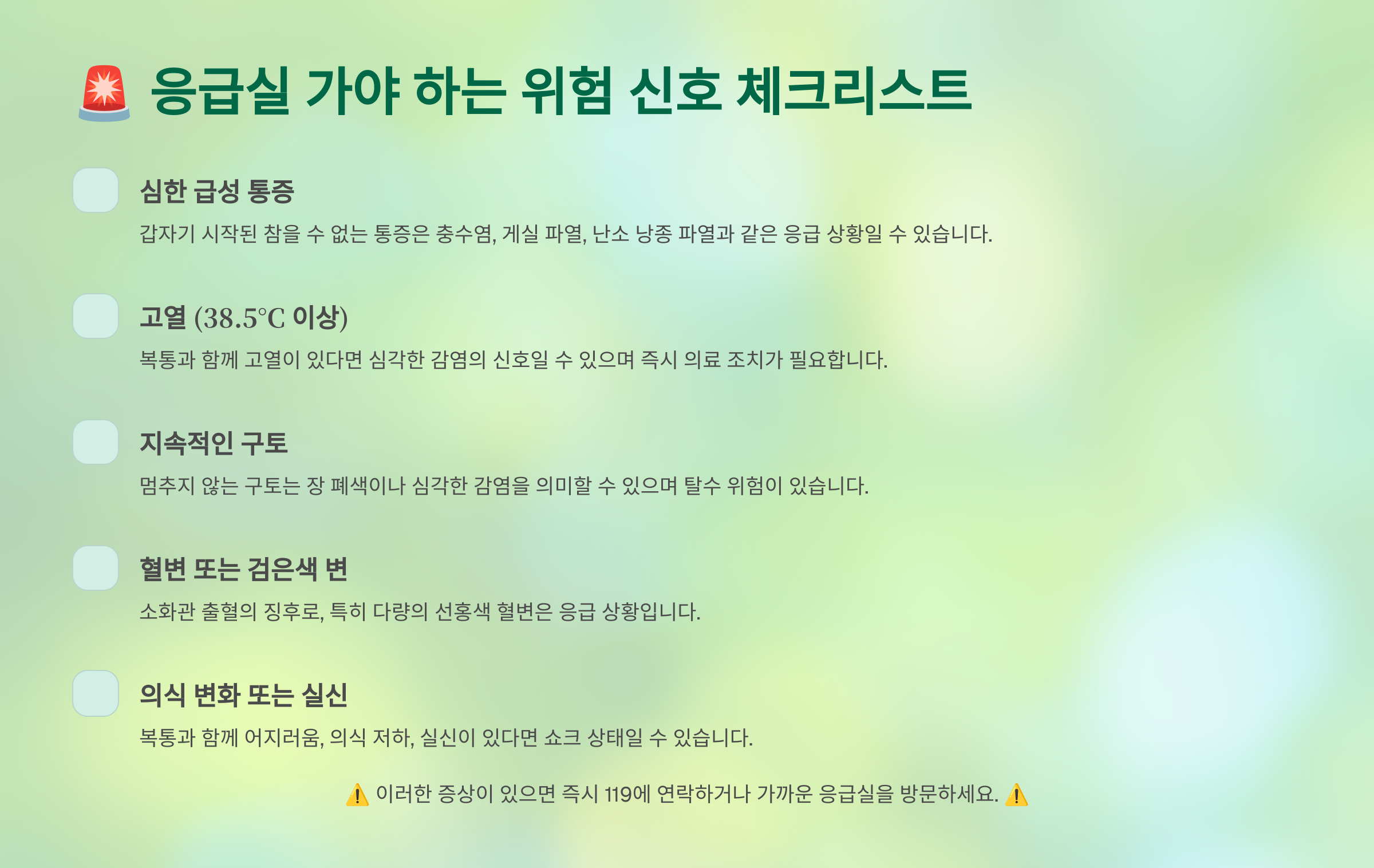 특히 갑자기 숨쉬기 힘들 정도의 복부 경직, 혈압·맥박 이상, 소변 정지, 의식이 흐릿해지는 증상은 진짜로 생명을 위협할 수 있으니 반드시 즉시 119나 응급실로 가야 해요!