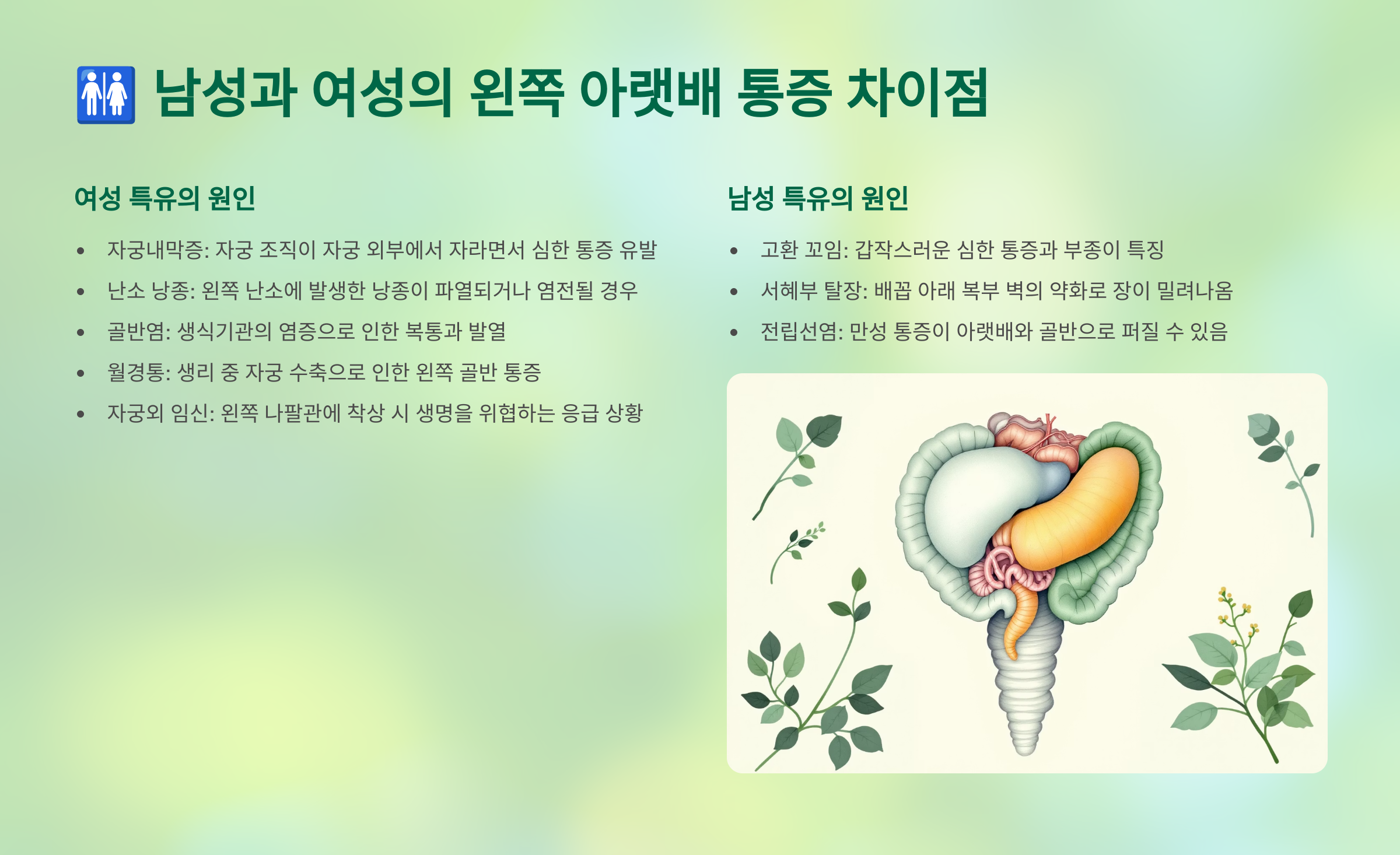 여성은 좌측 난소와 난관이 있기 때문에 배란통, 난소낭종, 자궁내막증, 골반염증성질환 등 부인과적 원인을 반드시 감별해야 해요. 특히 임신 가능성이 있는 여성은 자궁외임신 같은 치명적 응급상황까지 염두에 둬야 하죠.