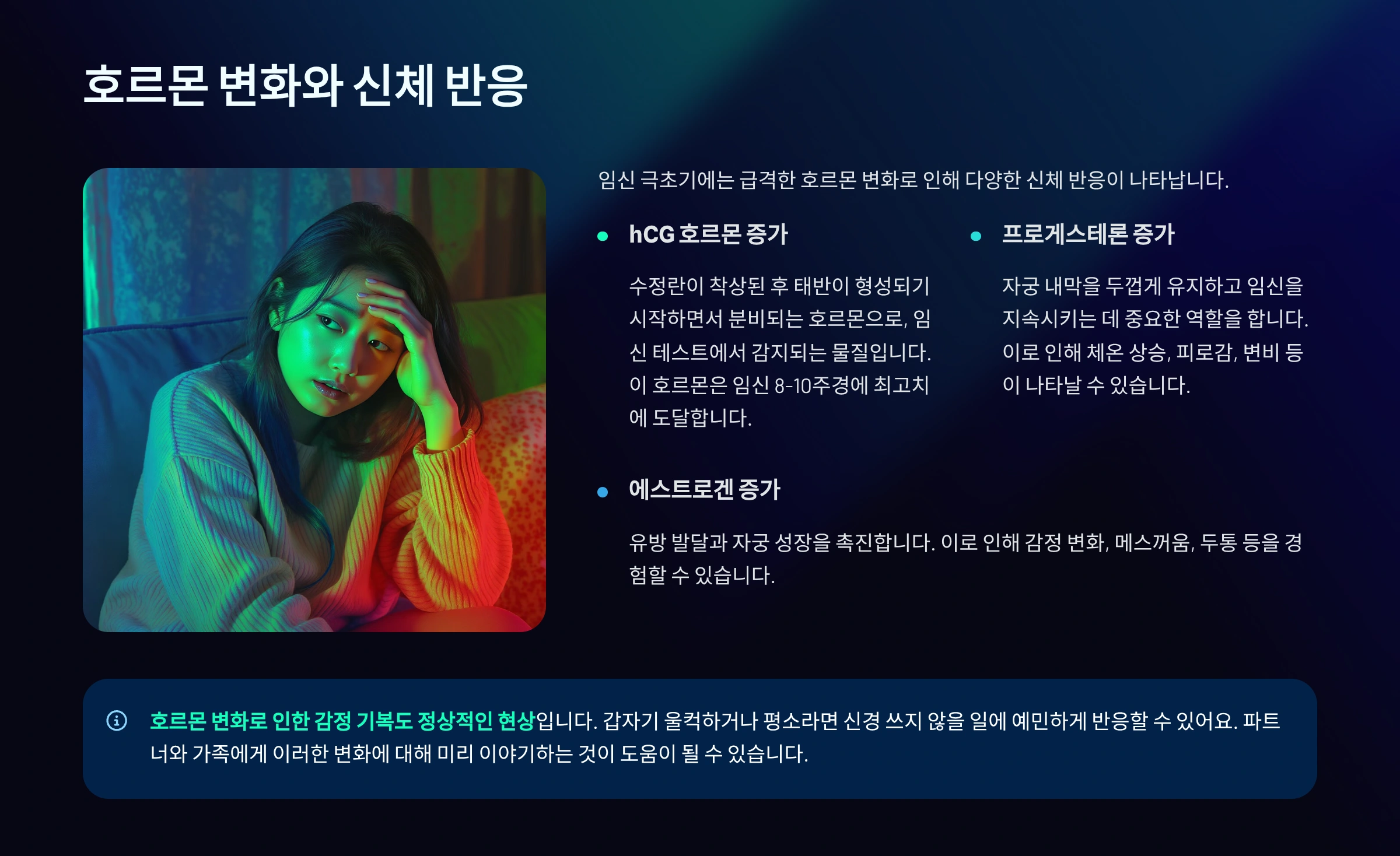 2025년 최신 연구에서는 극초기 호르몬 변화가 뇌 신경전달물질에도 영향을 미친다는 사실이 밝혀졌어요. 감정 기복이나 예민함이 심해지는 이유가 단순한 심리 변화가 아니라, 호르몬과 뇌 화학 반응이 맞물린 결과라는 거죠.