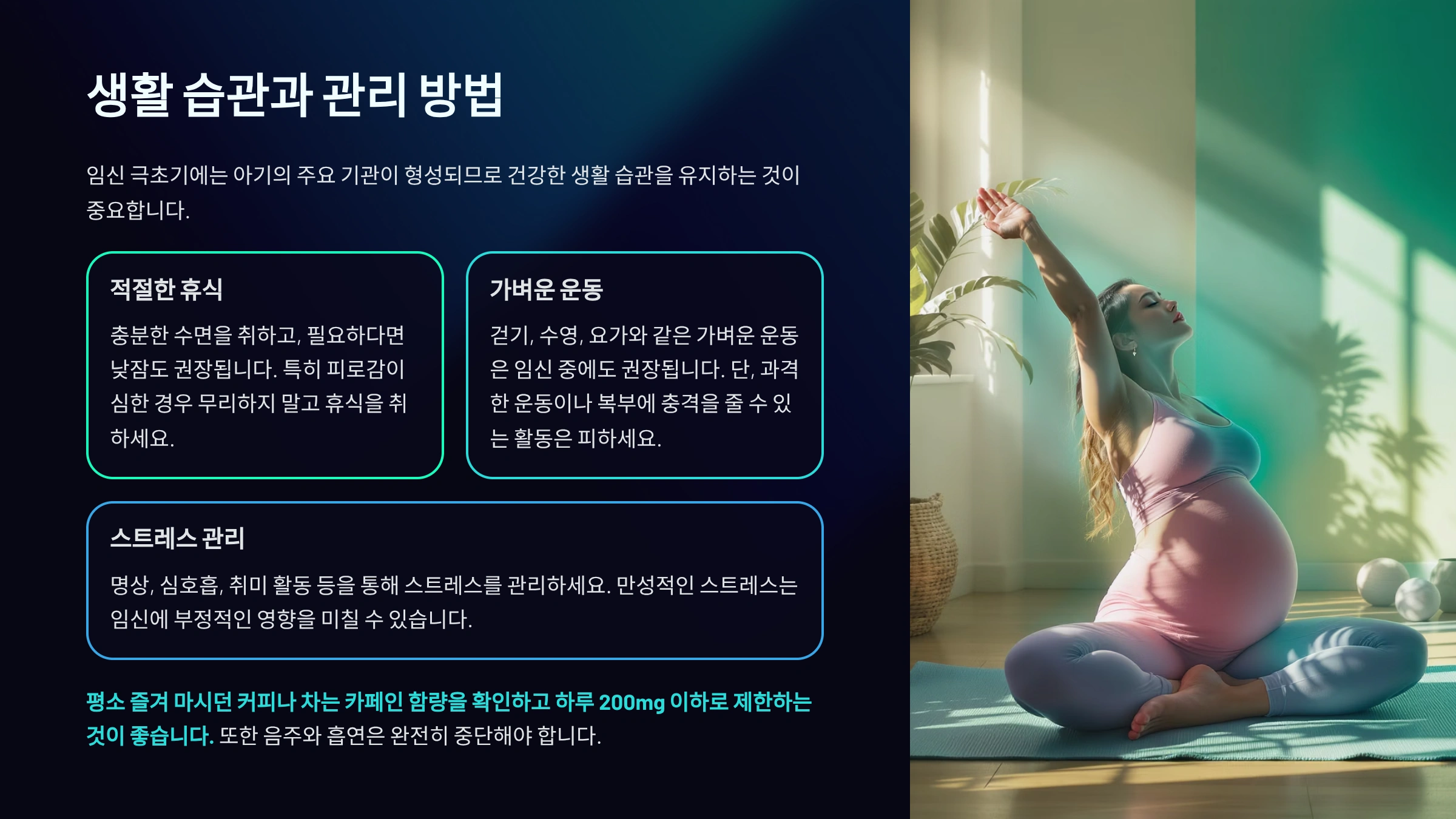또한 극초기에는 임신부 본인도 뚜렷한 자각 증상을 느끼기 어려운 경우가 많아요. 하지만 호르몬 수치와 자궁 상태는 이미 변화 중이므로, 체력 관리와 균형 잡힌 영양 섭취가 중요해요. 특히 카페인, 알코올, 과도한 스트레스는 착상 환경을 방해할 수 있기 때문에 이 시기부터 줄이는 것이 좋아요.