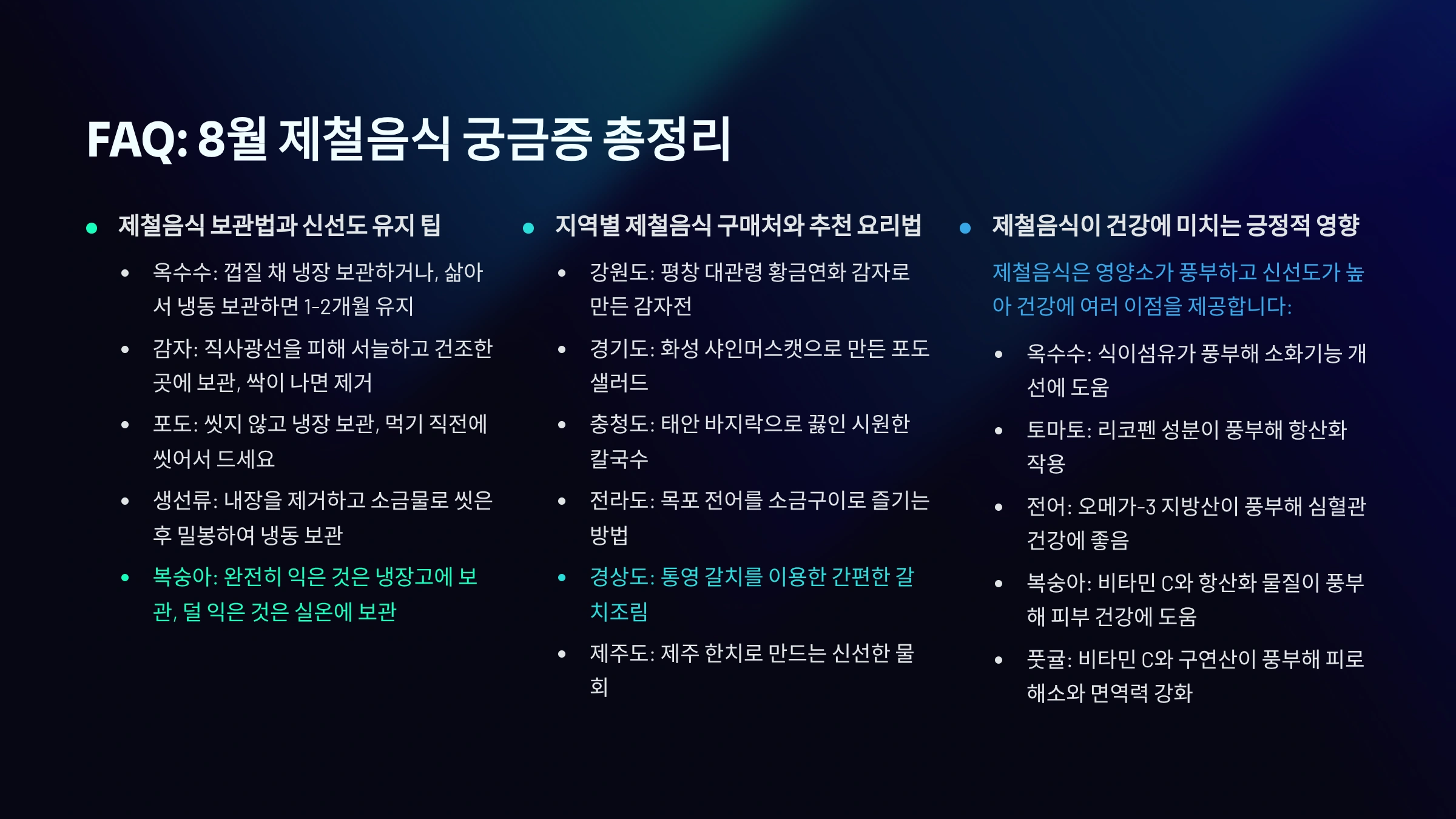 A8. “8월 제철음식”, “전국 8도 제철”, “지역별 제철 해산물”, “강원 옥수수 감자”, “경기도 포도 복숭아”, “충청 바지락 꽃게”, “전라도 전어 민어”, “경상 갈치 전복”, “제주 한치 옥돔”, “여름 보관법”처럼 지역+품목+계절 구조로 구성하면 클릭률이 올라가요.