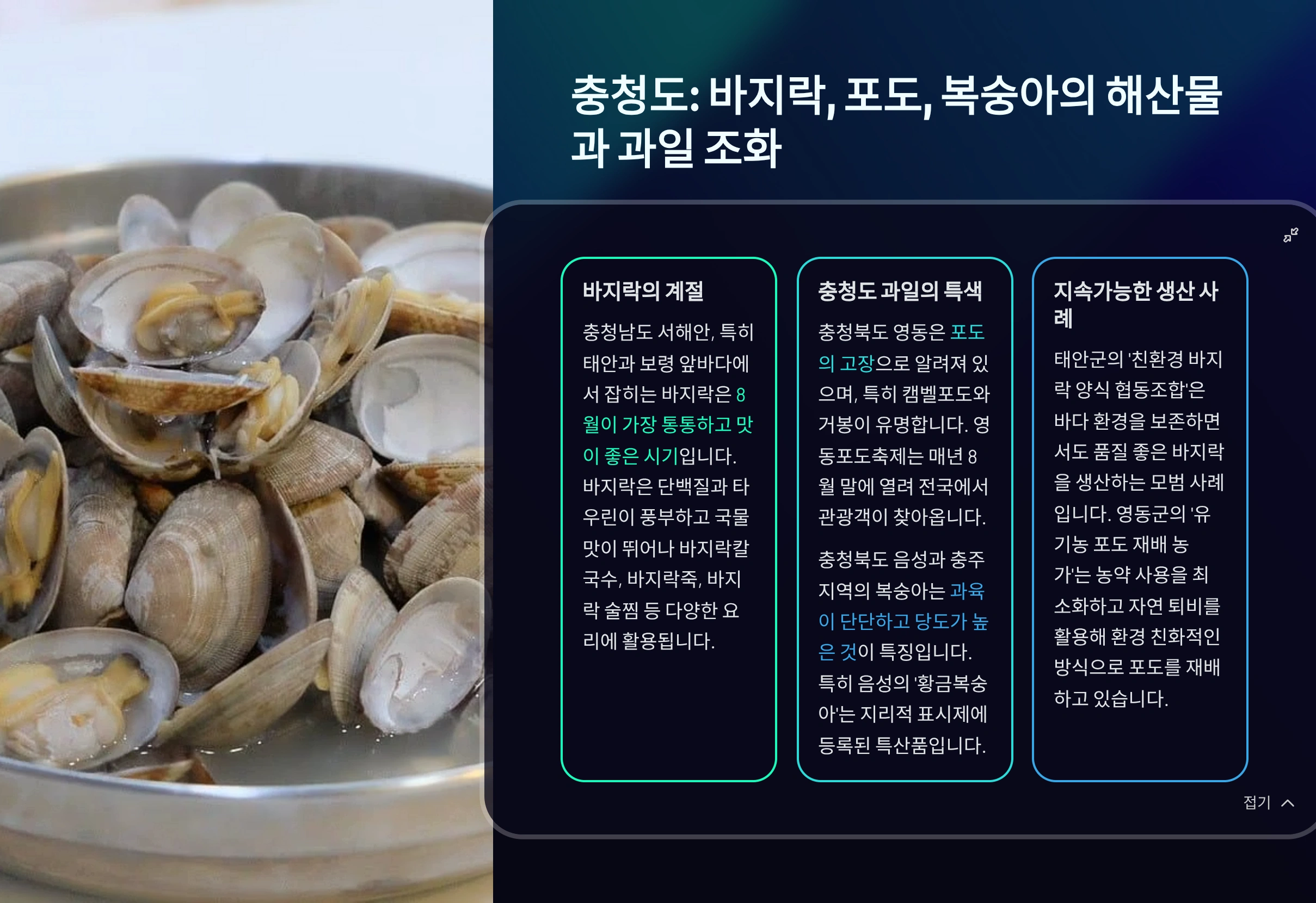 충청도는 서해의 풍부한 어패류와 내륙의 과일·채소가 함께 어우러진 지역이에요. 충남 서천, 보령, 태안 등 서해안에서는 바지락, 꽃게, 백합, 주꾸미가 한창이에요. 특히 바지락과 백합은 해감 후 탕이나 술찜으로 조리하면 여름철 시원한 국물 맛을 내죠. 꽃게는 8월부터 살이 차오르기 시작해 찜과 국물 요리에 제격이에요.