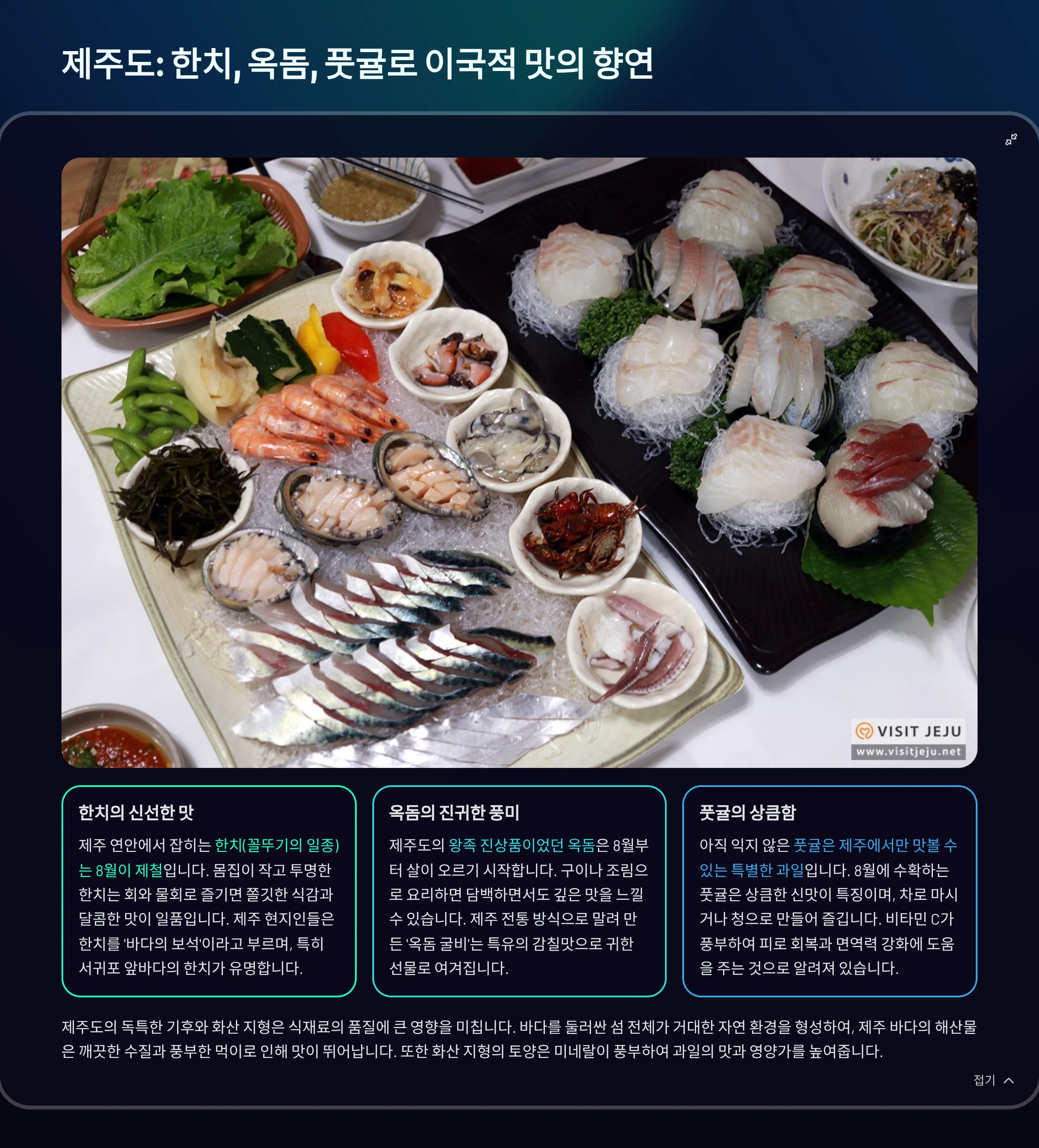 경상도의 여름은 바다와 육지가 함께 차려낸 푸짐한 밥상 같아요. 이제 마지막으로 제주도의 8월 제철음식을 살펴볼게요.