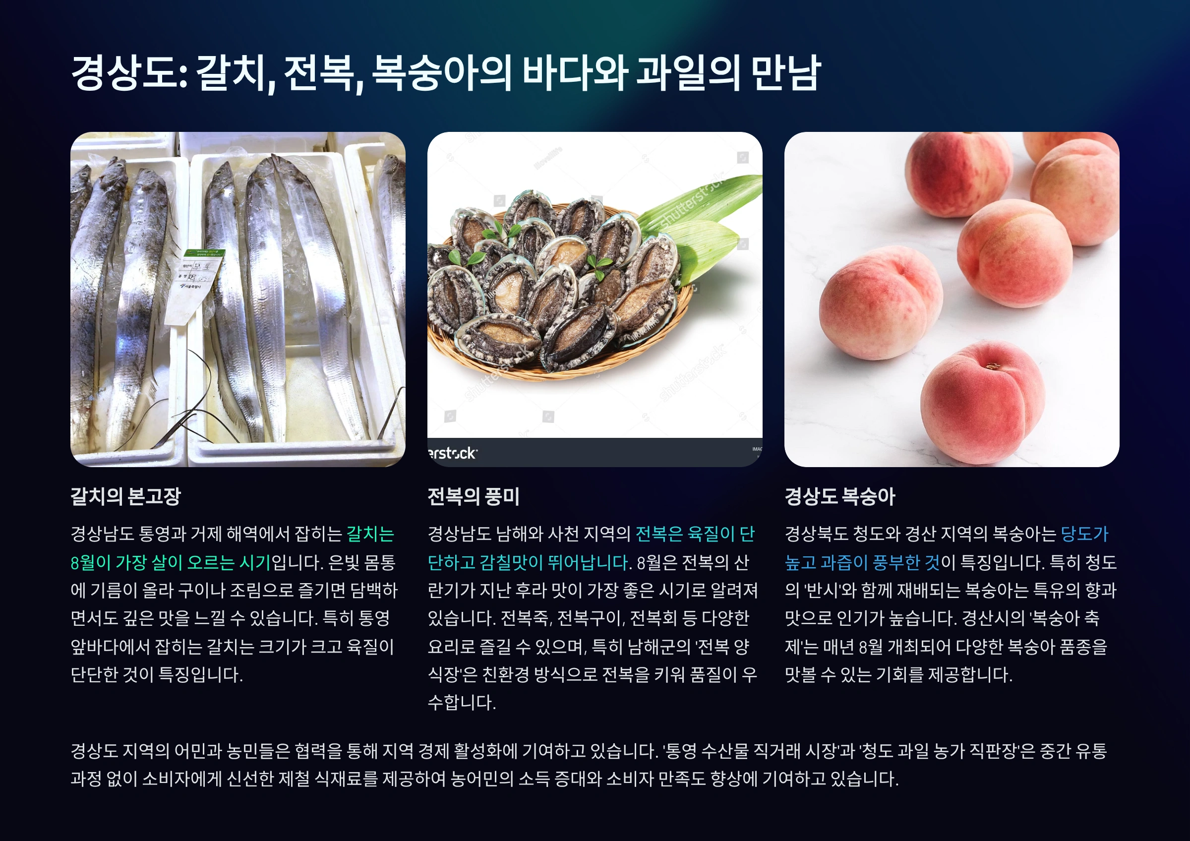 경상도는 동해와 남해를 모두 품고 있어 8월에는 해산물과 육지 농산물이 고르게 풍성해요. 동해안(포항, 울진, 영덕)에서는 대게·오징어·가자미가 여름철에도 꾸준히 잡히고, 남해안(통영, 거제, 남해)에서는 전복, 해삼, 문어, 갈치가 제철이에요. 특히 통영과 거제의 갈치는 은빛 비늘이 살아 있고 살이 부드러워 조림·구이에 제격이에요.