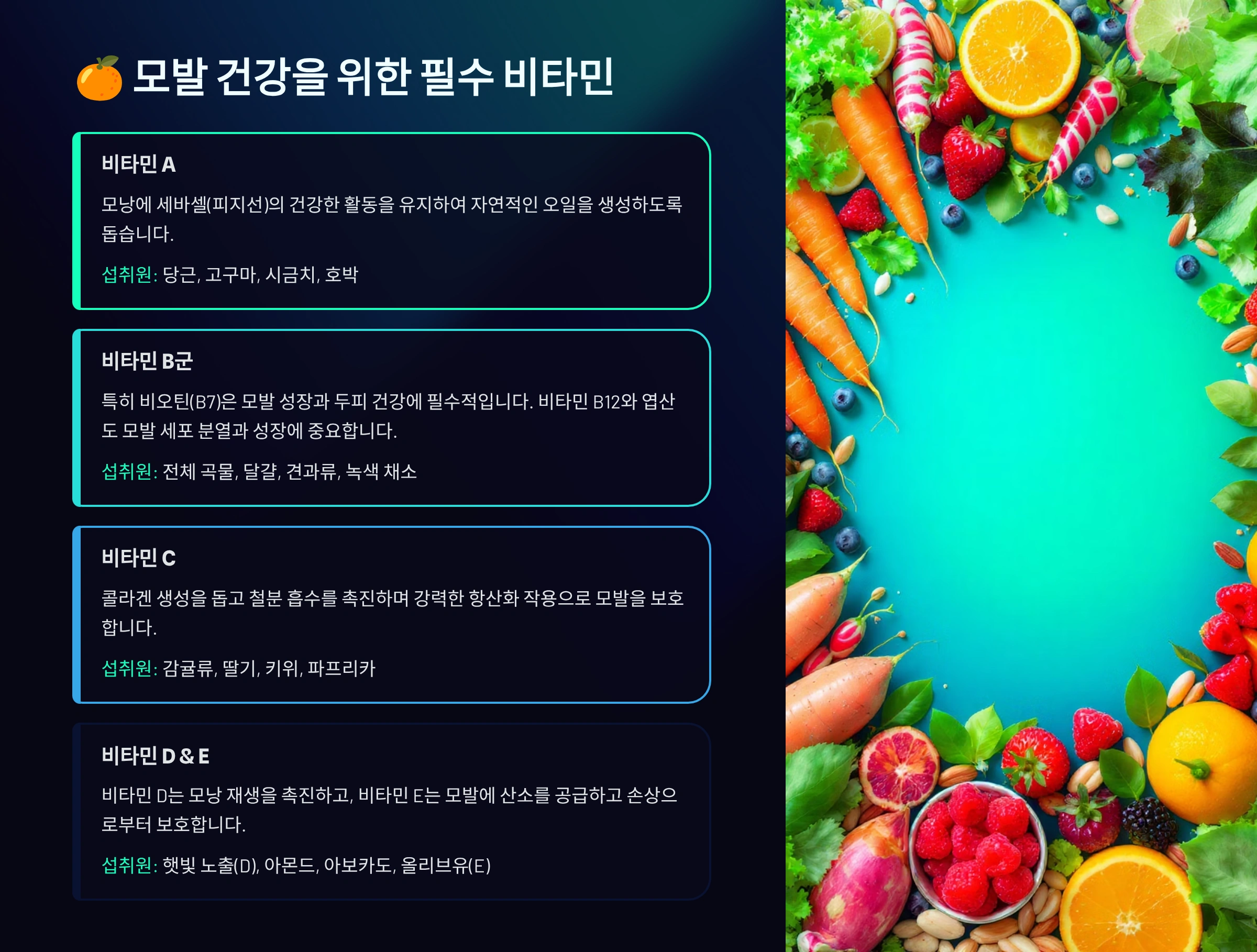 비타민은 모발과 두피 건강을 지키는 데 있어서 빠질 수 없는 영양소예요. 각 비타민은 역할이 다르지만 서로 시너지 효과를 내면서 탈모를 예방하고 모발 성장을 촉진해요.