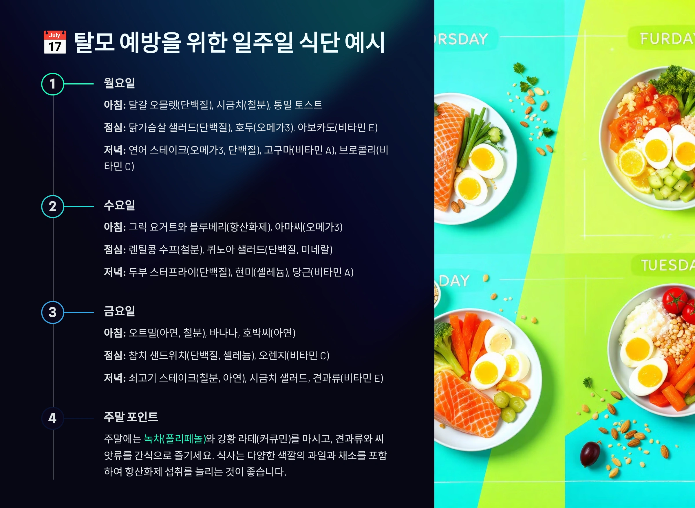저는 아침에 삶은 달걀과 시금치 샐러드를 함께 먹는 습관을 들였는데, 확실히 머리카락이 힘을 되찾는 느낌이 있었어요. 단백질과 철분을 함께 챙기면 탈모 예방의 기초가 된다고 할 수 있어요. 💪