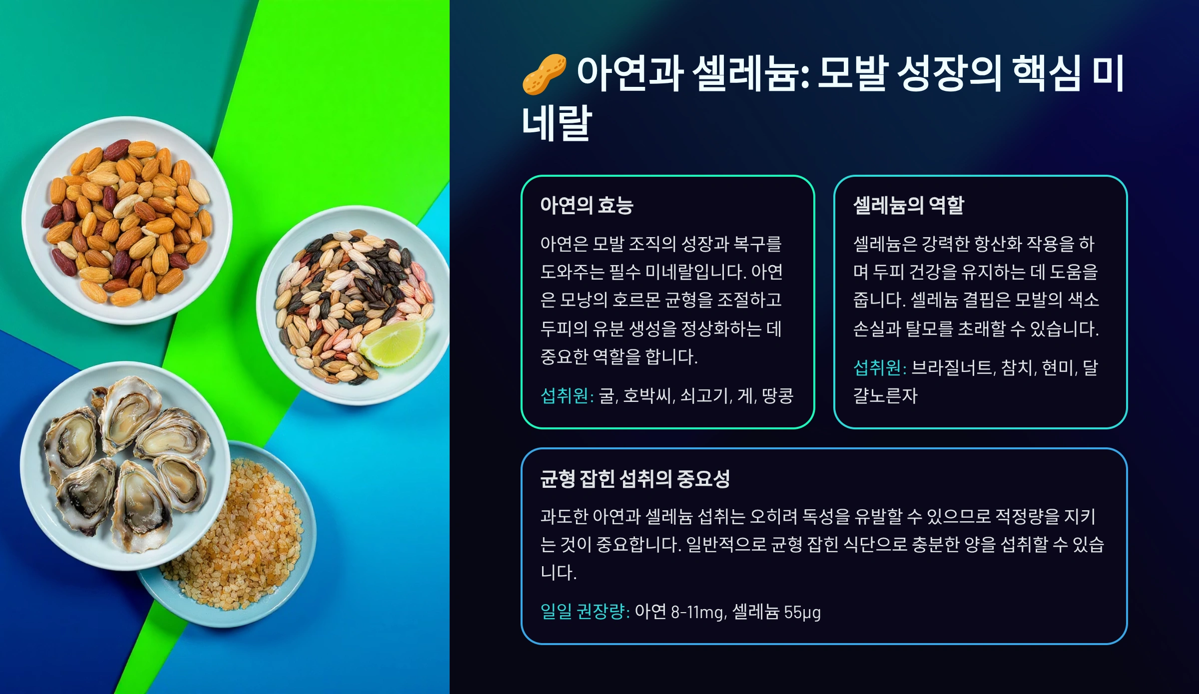 셀레늄은 강력한 항산화 미네랄이에요. 활성산소로부터 모낭을 보호하고 두피 세포 손상을 막아주죠. 또한 갑상선 호르몬 대사와 관련돼 모발 주기에도 간접적으로 관여해요. 결핍 시 모발이 푸석하고 약해지기 쉽답니다.