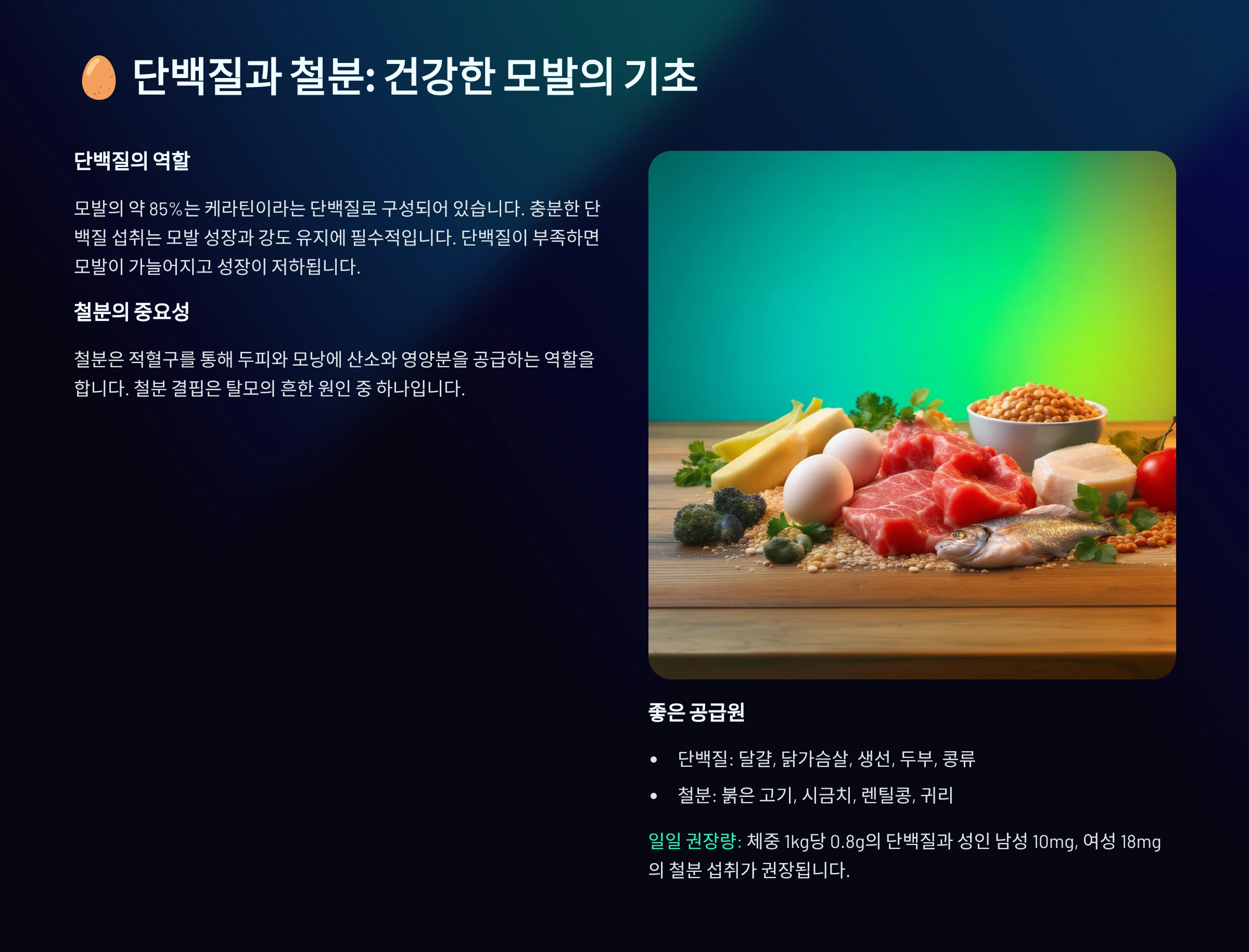 | 단백질 | 닭가슴살, 달걀, 두부 | 모발 합성 재료 공급 | 매끼 손바닥 크기 섭취 |