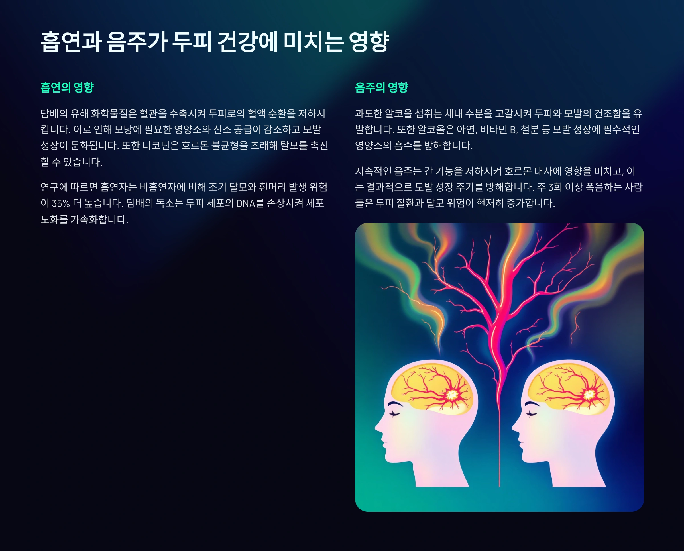 실제로 2025년 대한모발학회 연구에 따르면, 흡연자는 비흡연자에 비해 남성형 탈모가 1.8배 더 빠르게 진행된다고 발표했어요. 흡연은 단순히 모발뿐만 아니라 피부 노화도 촉진하기 때문에, 두피와 모발 건강에 모두 악영향을 끼쳐요.