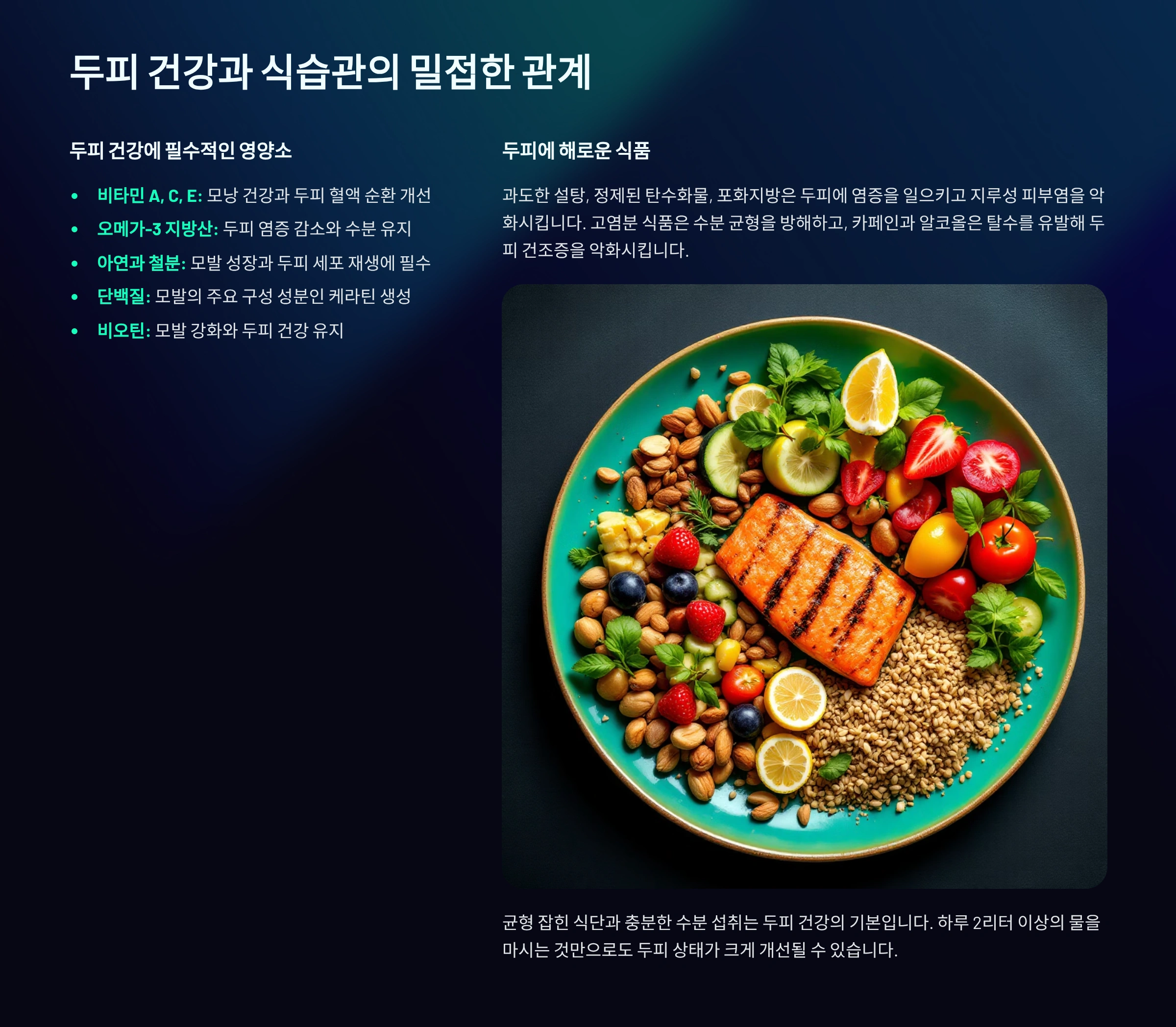 | 오메가3 | 연어, 고등어, 아마씨 | 두피 염증 억제 | 주 2~3회 생선 섭취 |