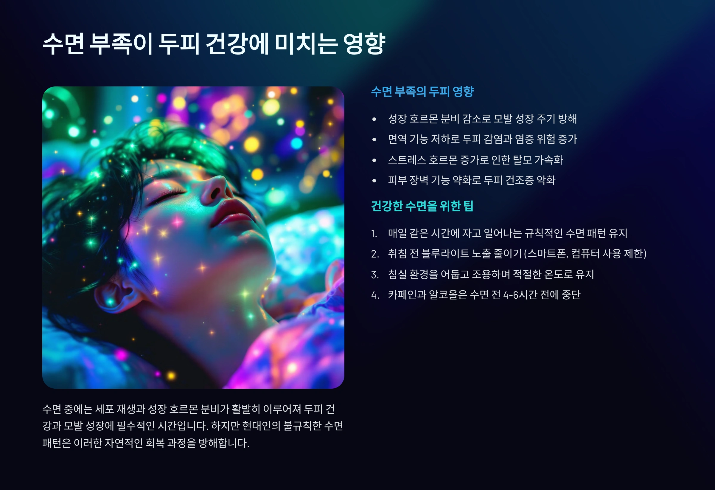| 수면 시간 | 평균 4~5시간 | 평균 7~8시간 | 모발 성장 촉진 |
