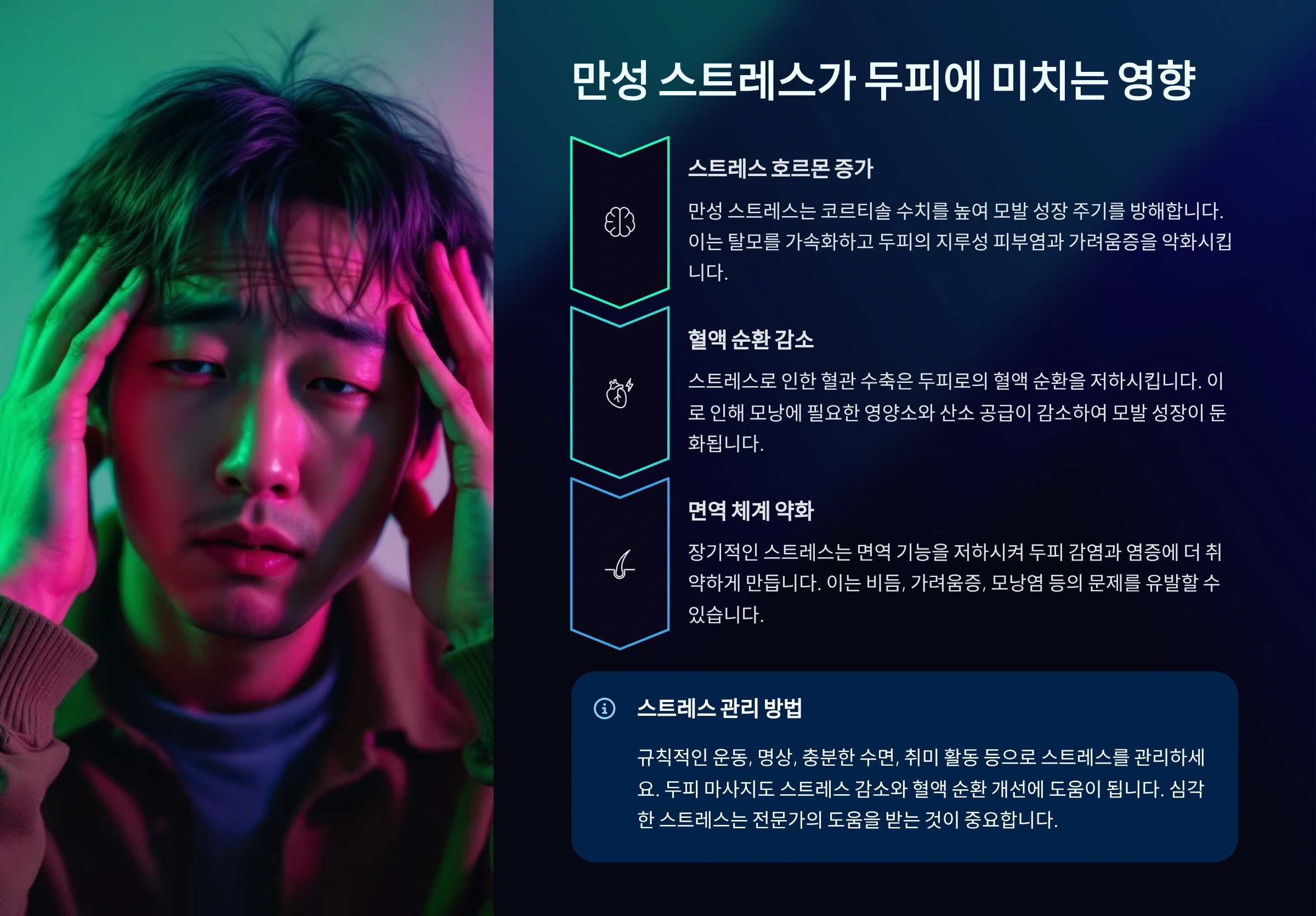 또한 수면 부족은 면역력 저하와 함께 스트레스를 가중시켜, 탈모와 피부 트러블을 동시에 일으킬 수 있어요. 머리카락은 신체의 가장 말단 부위에서 성장하기 때문에, 영양과 산소 공급이 줄어들면 가장 먼저 영향을 받는 부분이에요.
