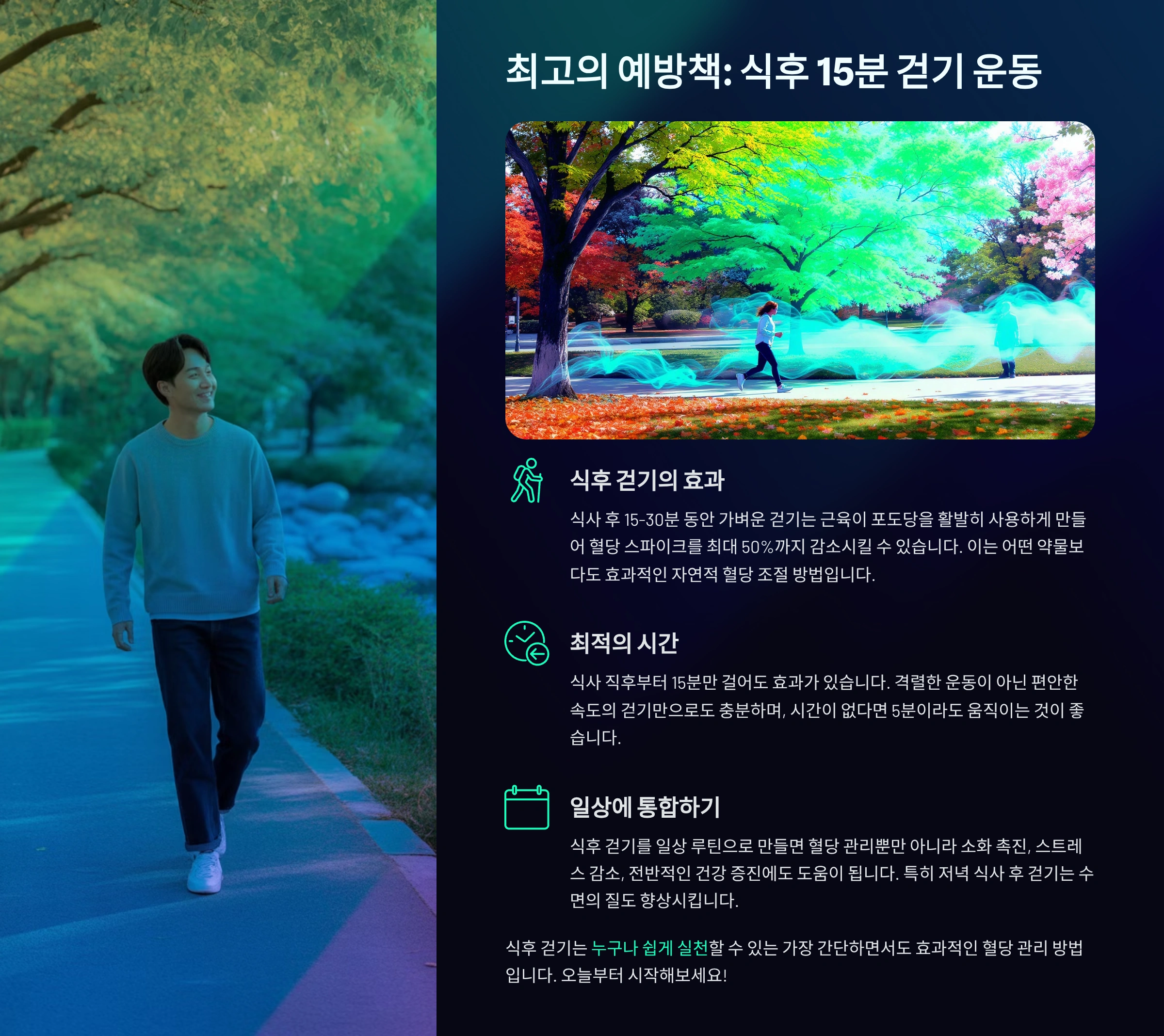 식사를 마친 후 15분~30분 이내에 15분 정도 가볍게 산책하거나 계단을 오르는 것만으로도, 우리 몸의 근육이 포도당을 에너지원으로 즉시 사용하게 만들어 혈당이 급격히 오르는 것을 막아줍니다. 점심 식사 후 사무실 주변을 잠시 걷거나, 저녁 식사 후 가볍게 동네 한 바퀴를 도는 습관을 들여보세요.