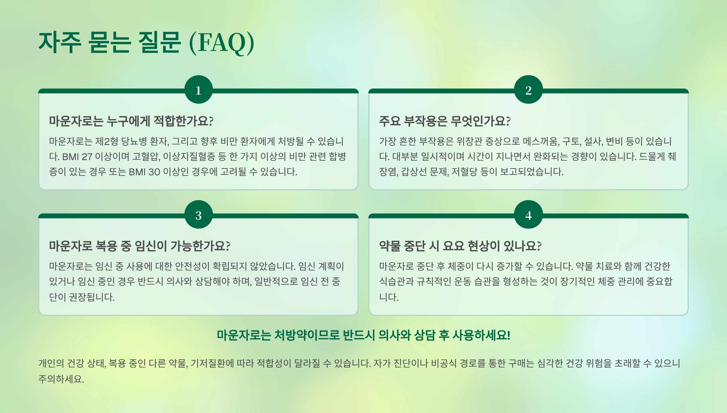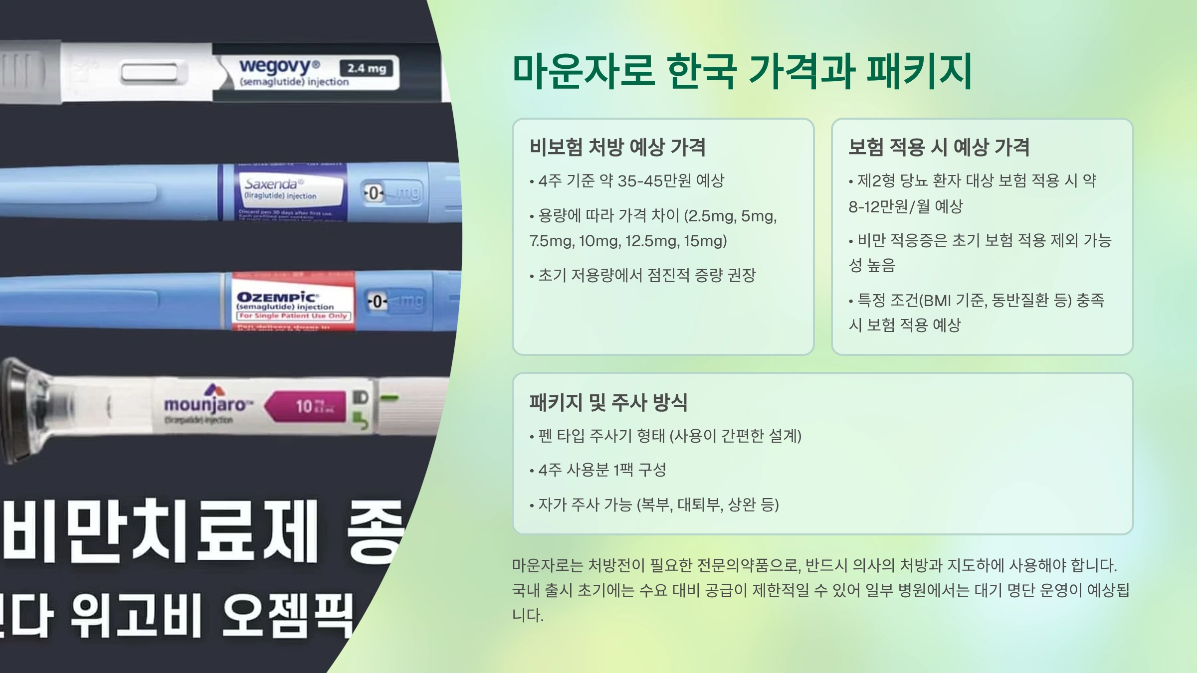 표를 보면 알 수 있듯이, 한국에서 마운자로를 사용하는 데는 여전히 가격 장벽이 존재해요. 다만 해외보다 저렴하다는 점, 그리고 추후 보험 적용 범위가 확대될 수 있다는 기대감 때문에 많은 환자들이 관심을 보이고 있어요.
