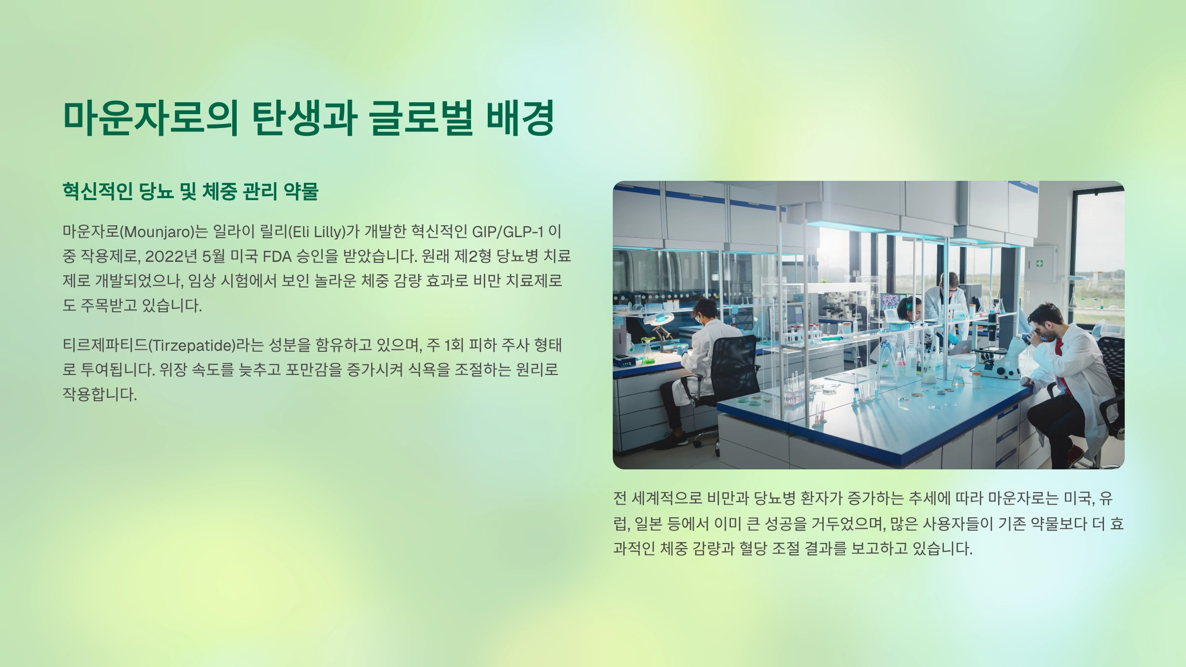 | GLP-1 주사제 대중화 | 마운자로·오젬픽 중심 | 글로벌 수요 급증 |
