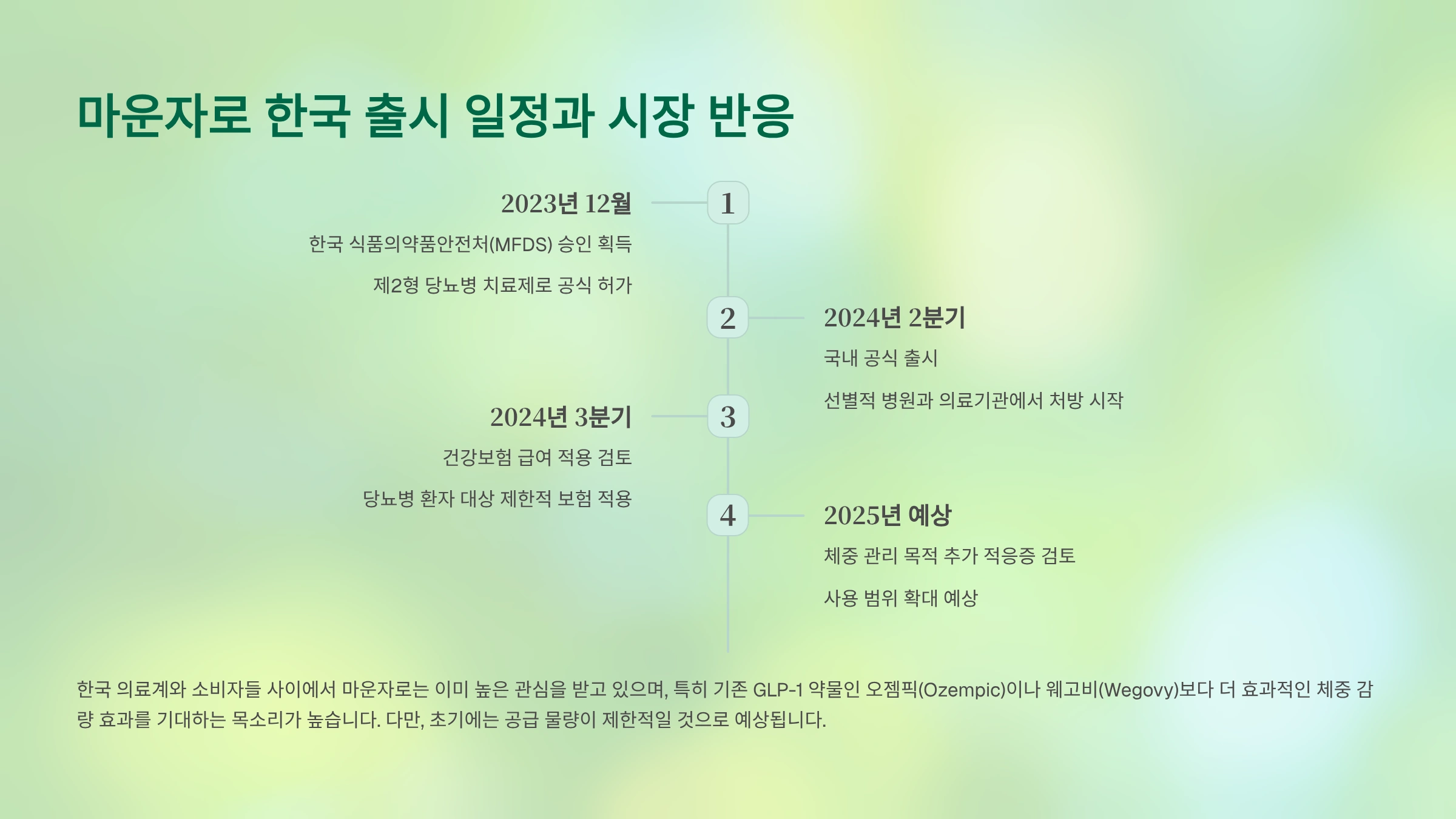마운자로는 2025년 3월 한국 식품의약품안전처(MFDS)로부터 공식 승인을 받아 처방이 가능해졌어요. 그동안 한국 환자와 의료계는 출시 소식을 손꼽아 기다려왔는데, 특히 당뇨 환자뿐 아니라 체중 감량을 원하는 일반 소비자들 사이에서도 큰 화제가 되었답니다. 글로벌에서 이미 검증된 효과 덕분에 국내 의료진도 빠르게 관심을 보이고 있어요.