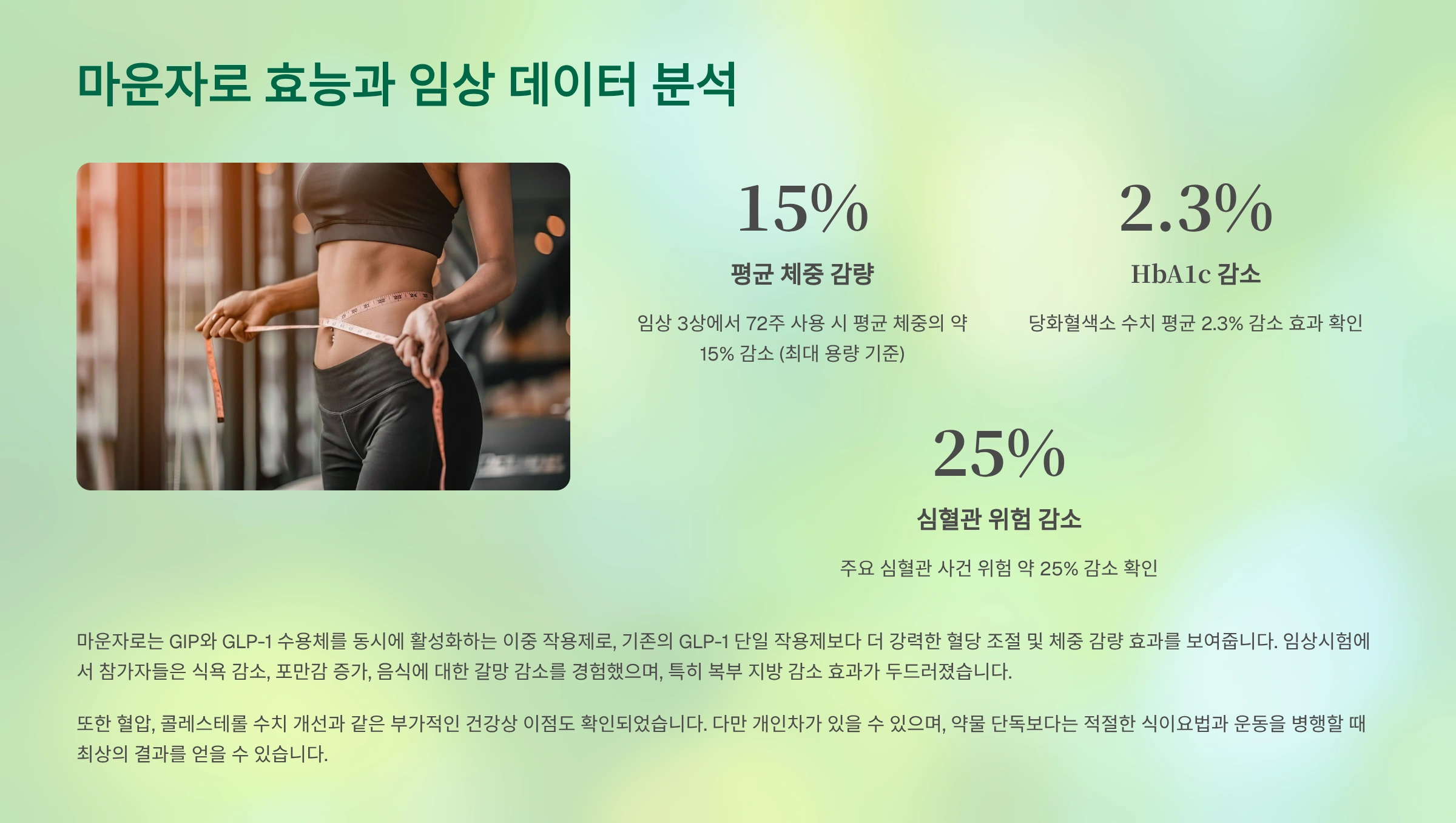 이 데이터를 보면 마운자로가 단순히 당뇨 치료제를 넘어, 비만 관리와 대사 질환 개선에 매우 강력한 옵션이라는 걸 알 수 있어요. 특히 장기적으로는 심혈관 질환 예방까지 기여할 수 있다는 기대감이 크답니다.