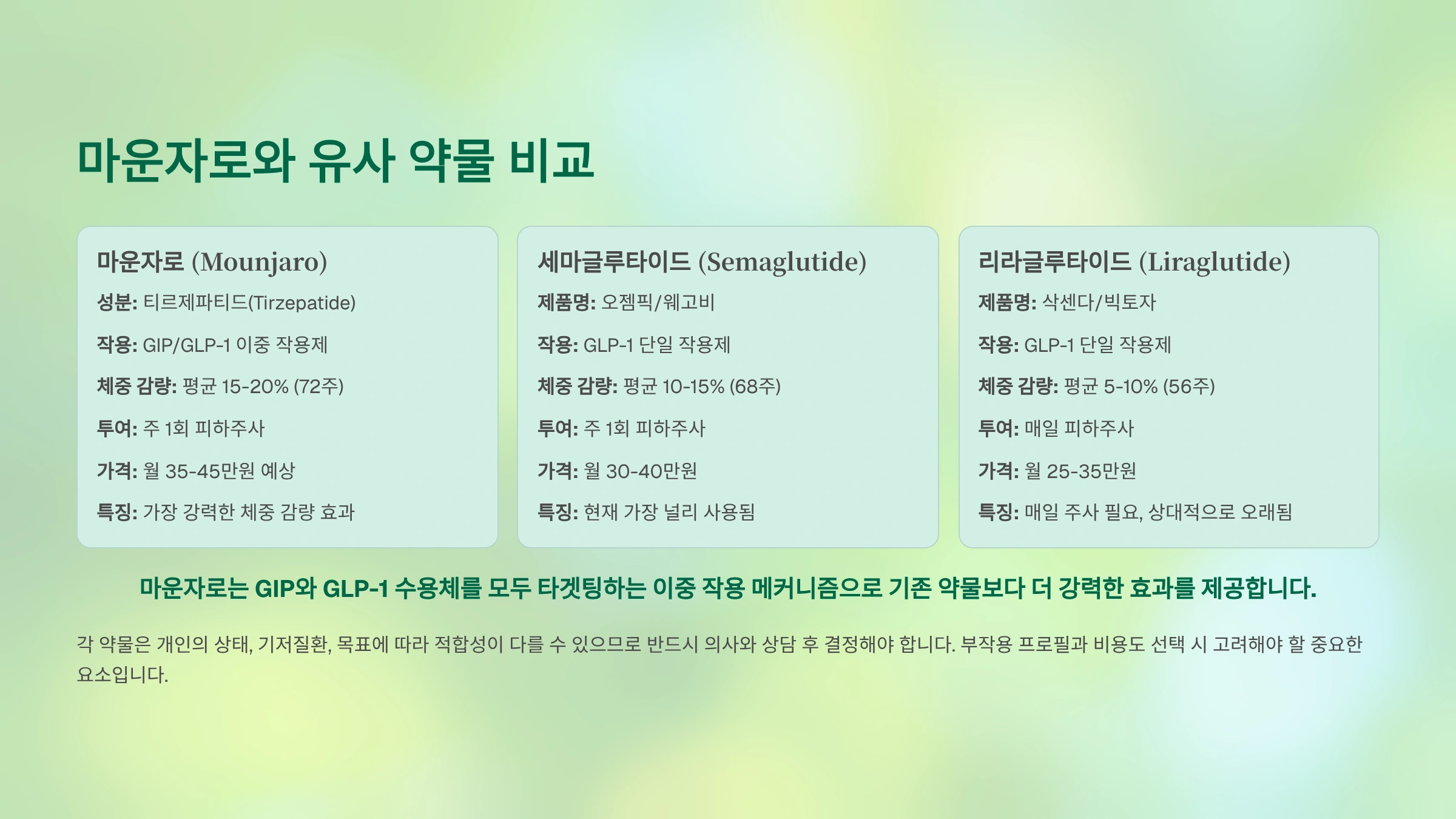 | 마운자로 | 티르제파타이드 | 주 1회 | 최대 20% 감소 | GLP-1 + GIP 이중 작용 |