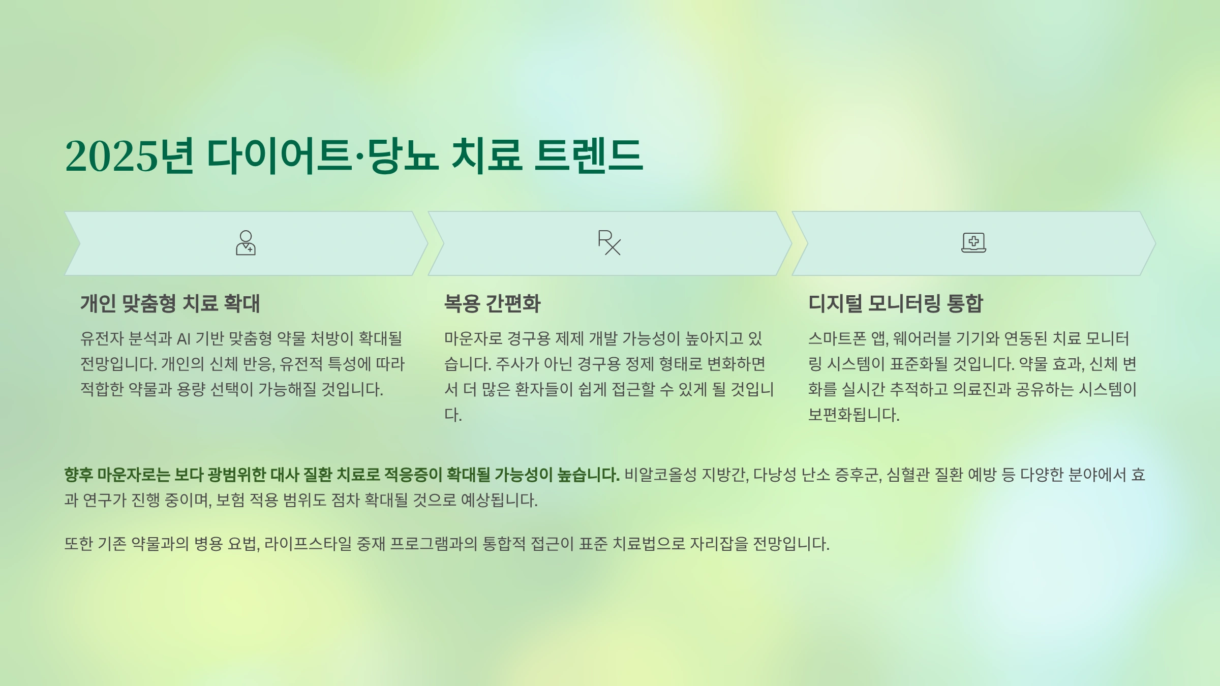결국 2025년의 다이어트·당뇨 치료 시장은 단순히 약물 하나로 설명할 수 없는 ‘융합’ 시대에 접어들었어요. 마운자로는 그 중심에 서 있지만, 동시에 앞으로 더 혁신적인 치료제들이 등장할 수 있다는 기대감도 커지고 있답니다.