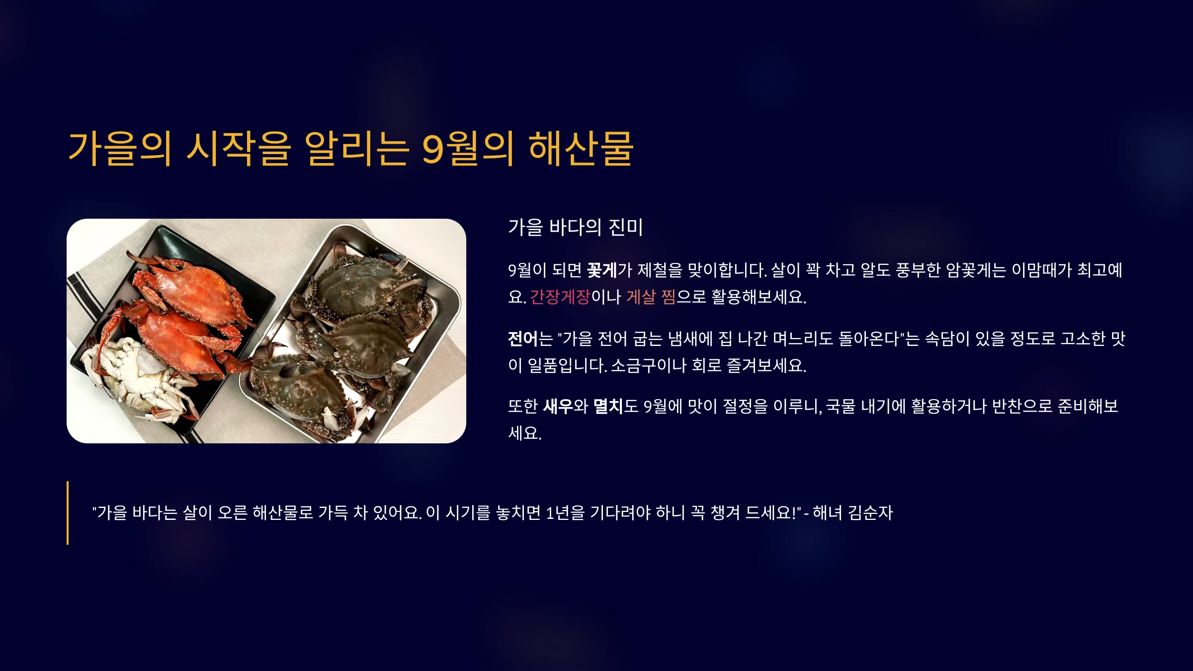 9월은 여름 동안 살을 찌운 해산물들이 가장 맛이 좋을 때입니다. 특히, 가을을 대표하는 해산물로는 '왕의 새우'라 불리는 대하와 고소한 맛이 일품인 전어가 있습니다.