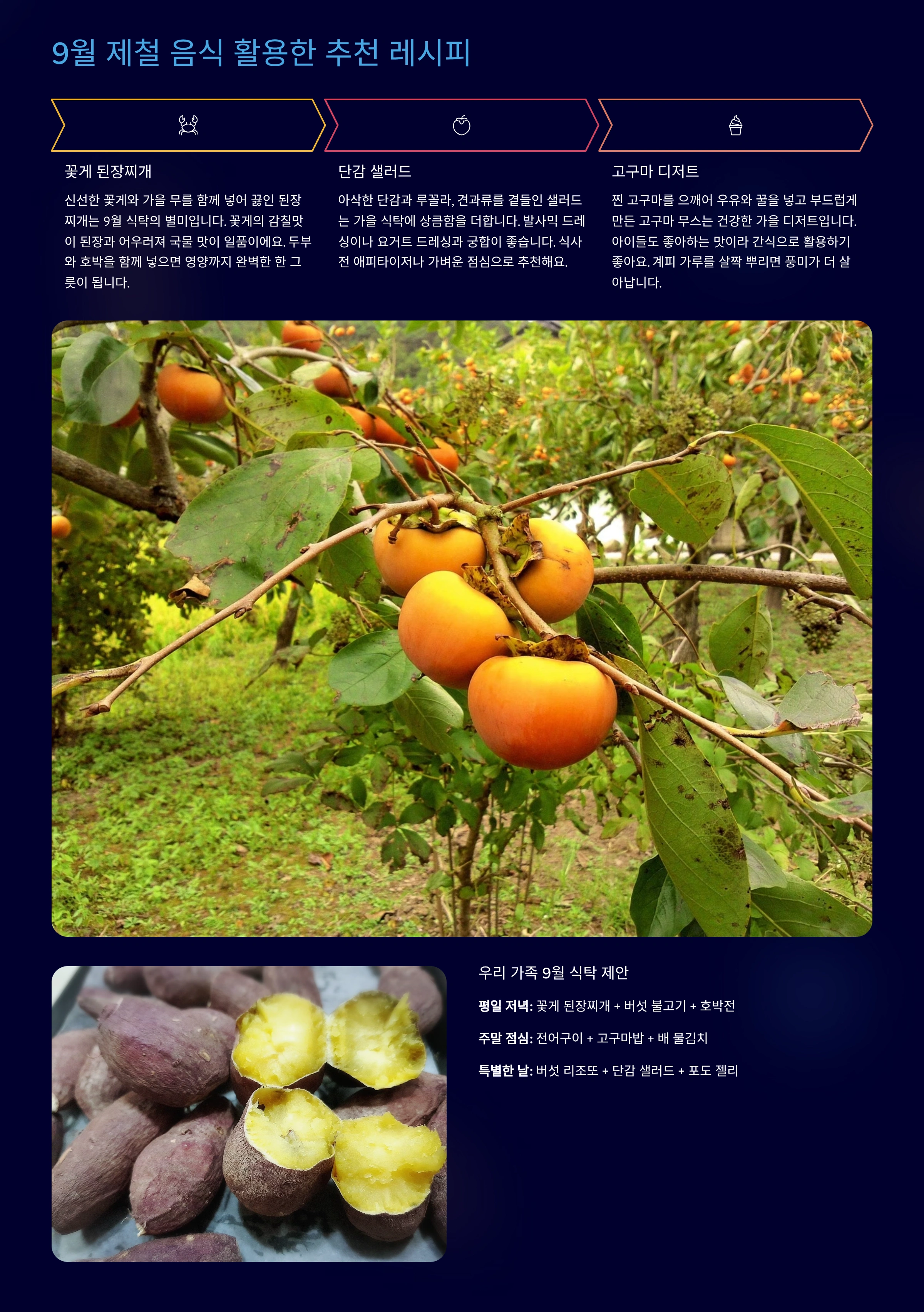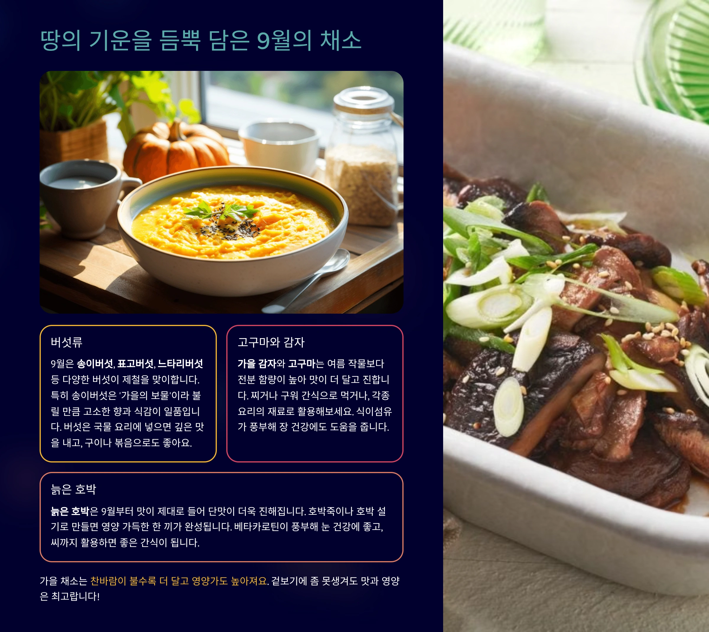 가을의 땅은 다양한 채소와 버섯을 길러냅니다. 9월에는 특히 고구마, 토란, 그리고 송이버섯이 제철을 맞이합니다.